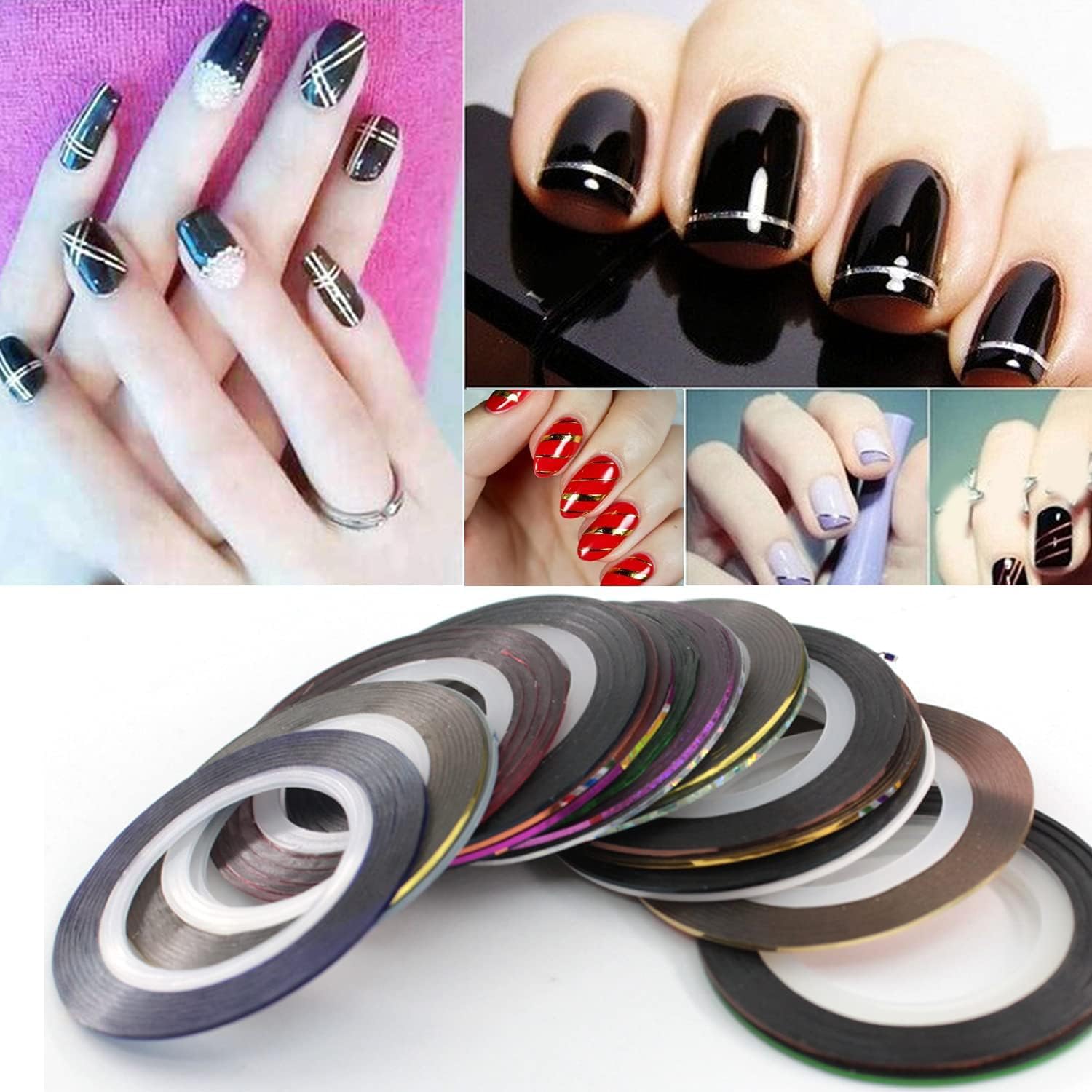 - ăColoră36 pcs Nail Art Striping Tape Line Sets,these nail foils tape are similarities but have a little different with color of size.Come with silver,golden,green,blue,red,purple etc chrome nail powder color nail art striping tape.ail gold tape.These nail art line tape stickers can be used to design your nail tumblers art,nail patterns,nail manicure tumbler etc.Aslo can be used with UV Gel,striping tape for nail art silver,etc.