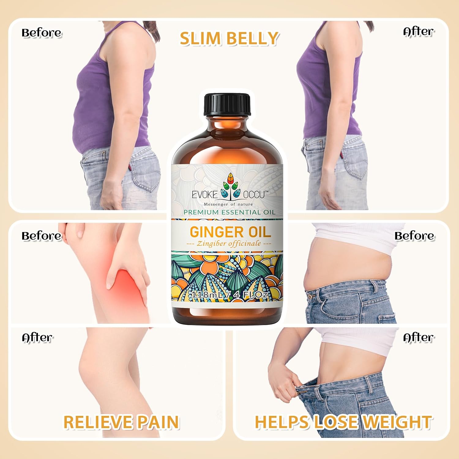 EVOKE OCCU 100% Pure Ginger Oil, Natural Ginger Essential Oil for Massage, Diffuser, Hair, Skin, DIY - 4 Fl Oz