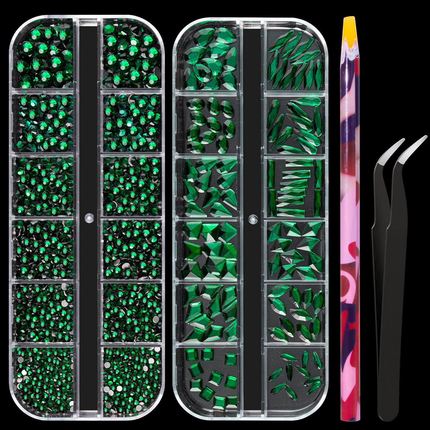 - ❤WHAT YOU WILL RECEIVE -- 1 Box of 6 Sizes Dark Green Round Glass Nail Crystal Rhinestones Beads (Totally About 1720 PCS); 1 Box of 12 Different Shaped Styles Dark Green Glass Stones Gem (About 120 PCS; 10 PCS for Each Shape); 1 PCS Rhinestone Picker Pencil; 1 PCS Tweezer. The Well Equipped Rhinestone Set Is Suitable for Both Professional Nail Technician and Inexperienced Starter for Nail Art.