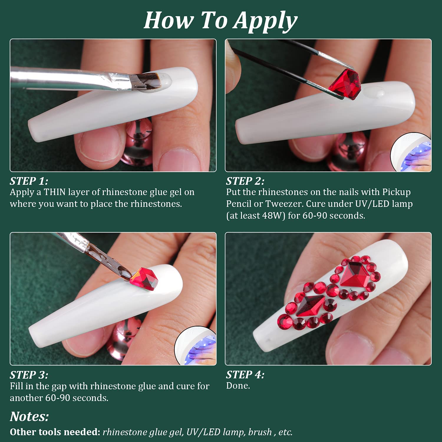 - ❤HELPFUL PICK-UP TOOLS -- The Tools Can Be Used for Multi-Function, including Round and Multi-shaped Crystals, or Flatback or Non-Flatback Crystals. After Applying Nail Polish, Just Simply Use the Equipped Tools ( Pickup Pencil + Tweezer ) to Pick Up the Crystals onto Your Nails to Create Your Fabulous DIY Designs! They Are Very Helpful in Picking Up Small Crystals. Just Make Sure You Make the Rhinestones Face up First Before You Start Working on Your Nails.
