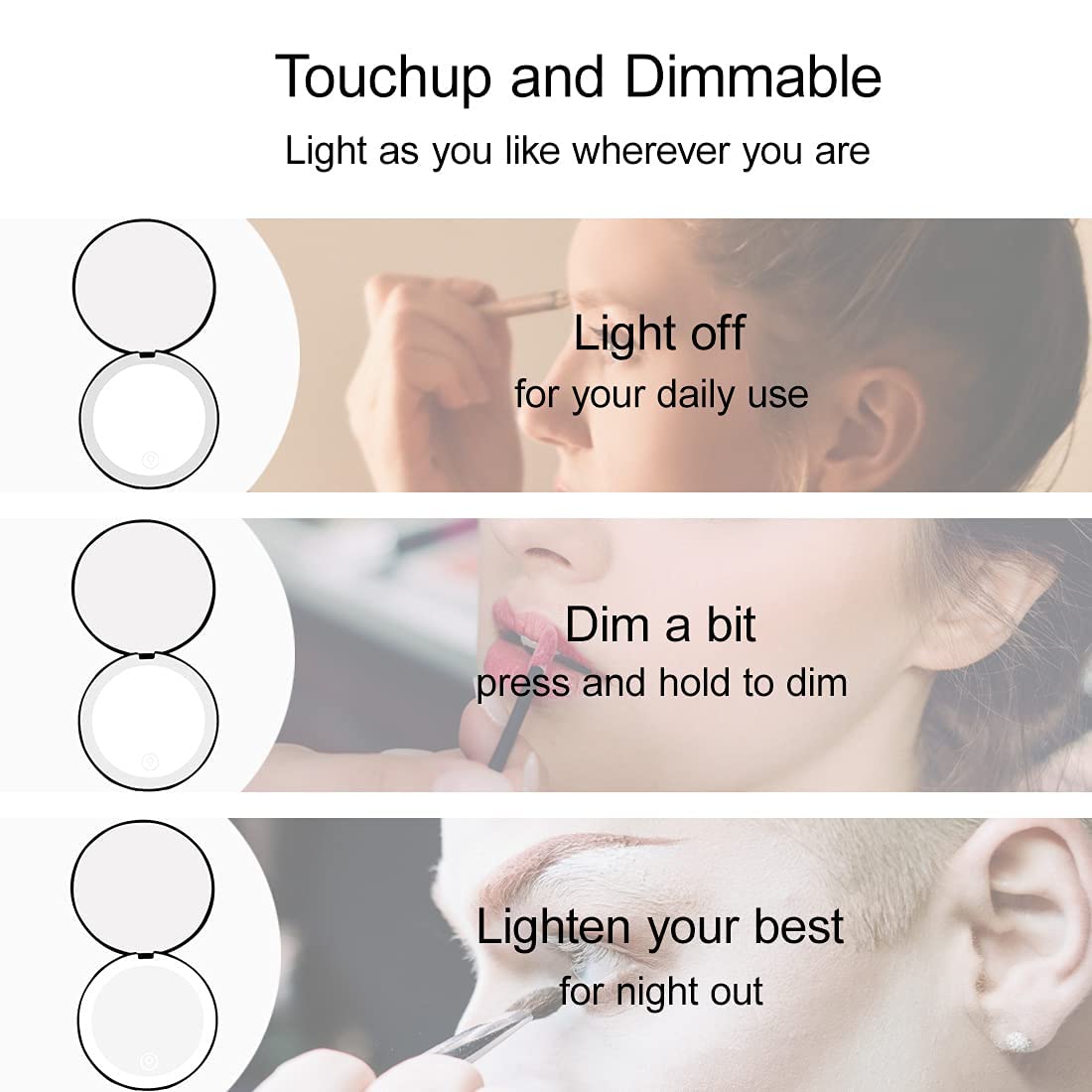 • 【Rechargeable LED Compact Mirror】: Lighted compact mirror with LED light is rechargeable. Soft LED ring light simulates daylight help you to create the flawless makeup. Elegant design for all the occasions such as daily use, party, date or travel.