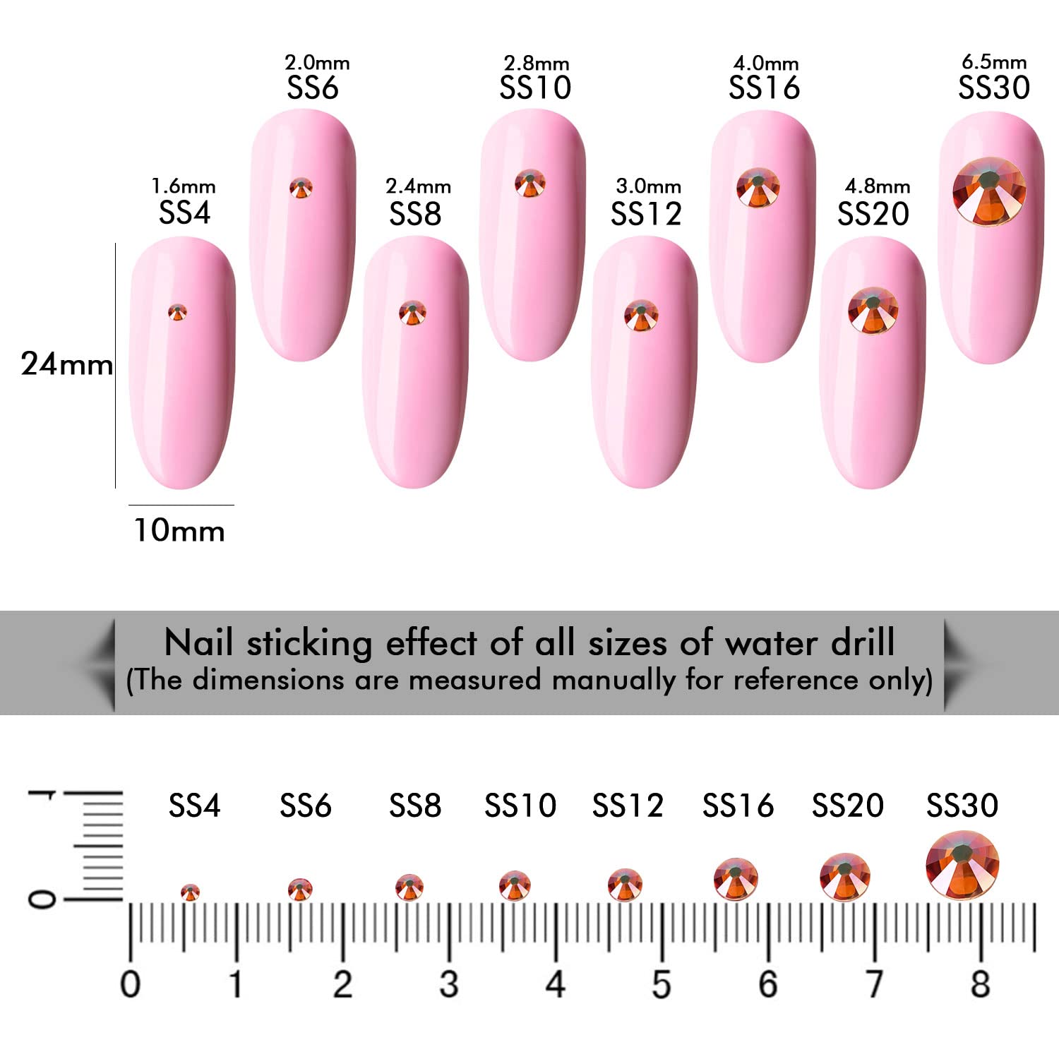 - Different Sizes Available:These rhinestones for crafts come in a wide range of sizes (1.6mm, 2mm, 2.4mm, 2.8mm, 3mm, 4mm, 4.8mm) to suit your different needs
