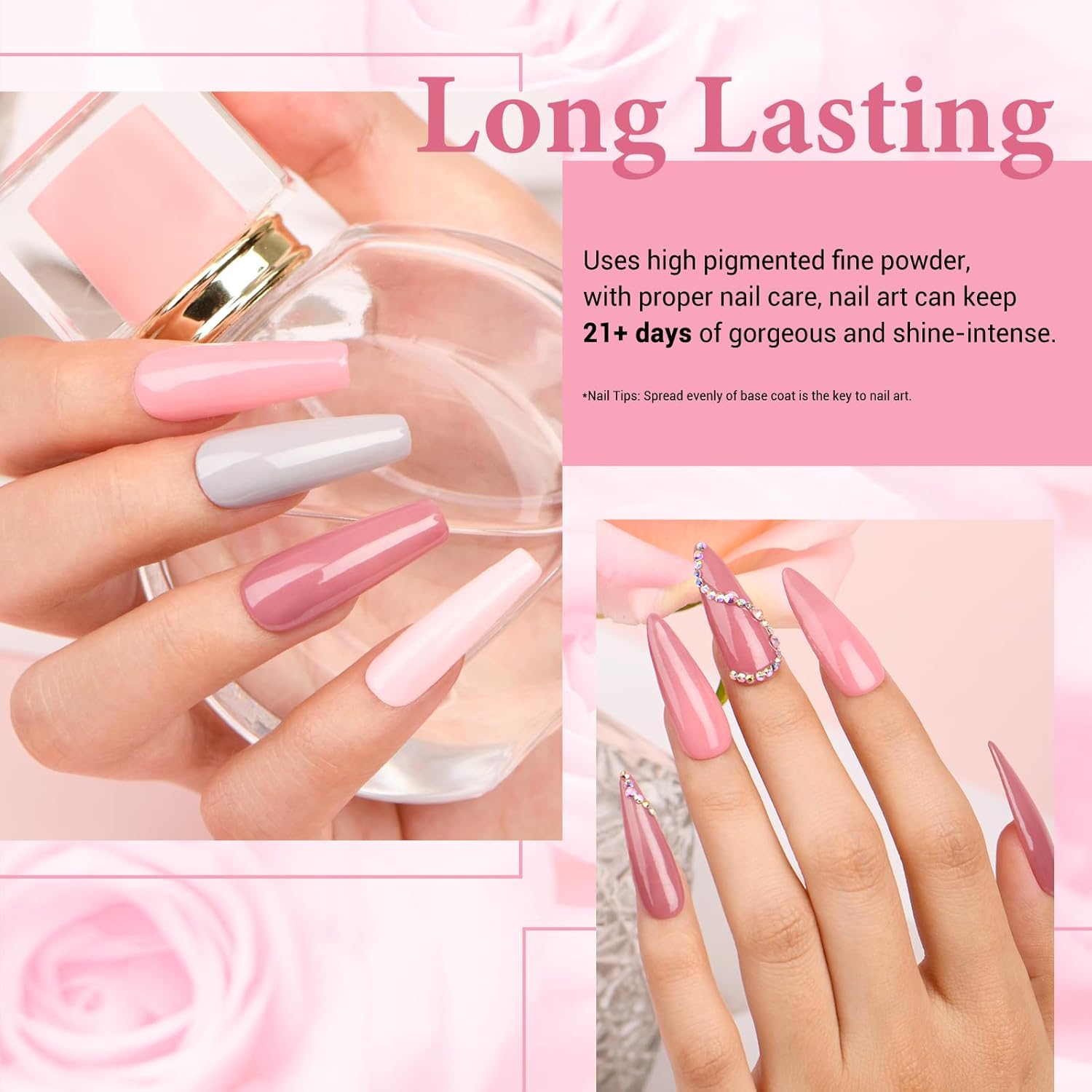 - âąăăSuperior Quality & Long Lastingă AZUREBEAUTY dip powder nail kit is long-lasting and anti-chipping, anti-peel off. The color is full and natural-looking, light, and has an impeccable shine finish. It can keep the nail art gorgeous and shiny for more than about 28 days with proper application. (REMINDER: The effection of dip powder may show differently in different people, 2~3 base coats while using will be the best.)