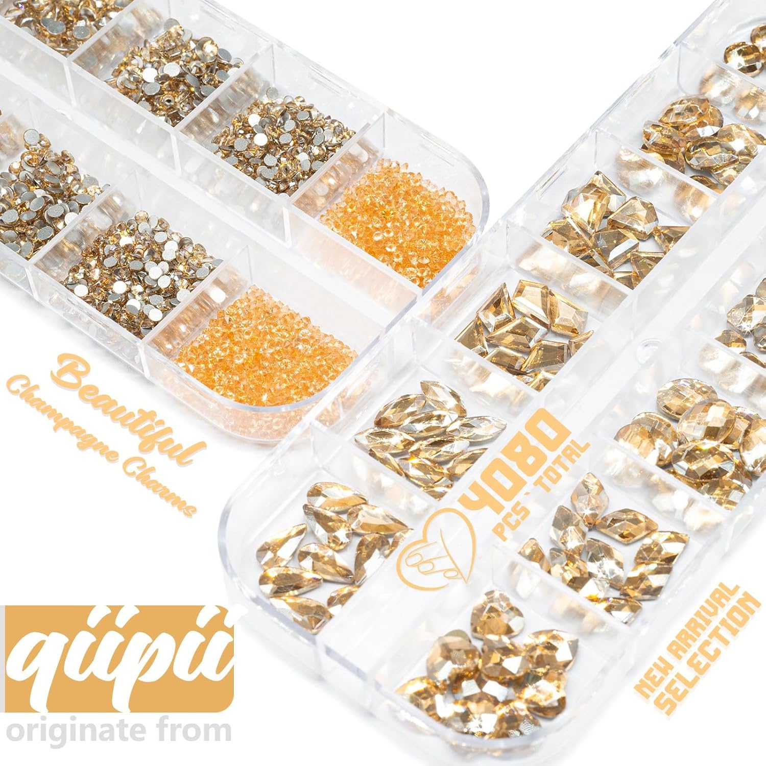 - ❤【4080Pcs More Quantity Crystal Champagne Gold Nail Rhinestones + Stainless Steel Tweezer + Pickup Pen】4080Pcs Sparkling Champagne Gold rhinestones nail crystals. Including 12-shapes crystal rhinestones, multi-sized round crystal gem rhinestones. Enough amounts and more shape options for your daily work, go out or other decoration purposes. Comes with 1 Stainless Steel Tweezer and Pickup Pen for Manicure DIY Decoration at Home Salon Supplies.