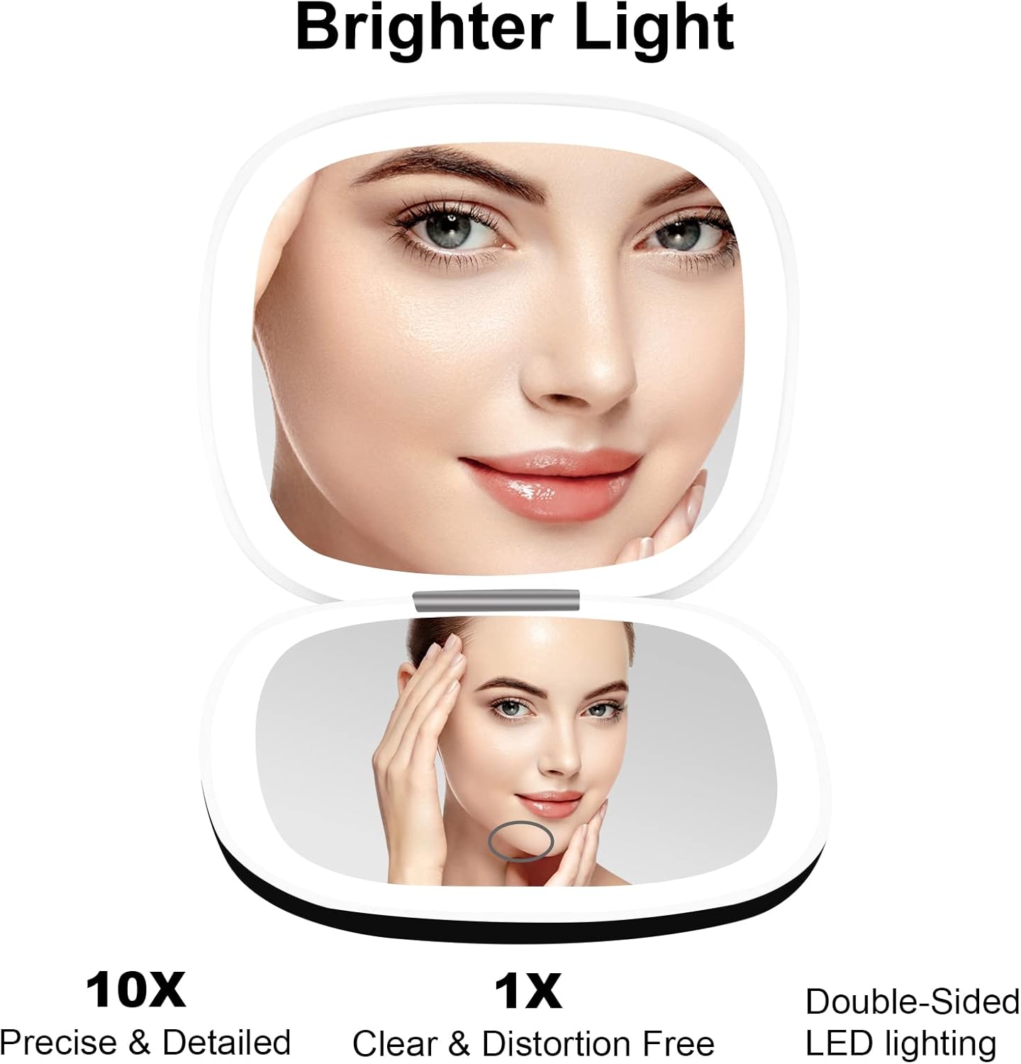 - *1X and 10X Magnifying,LED lights With both sides Makeup Mirror* The 1X true light mirror is very clear and suitabel for dayly makeup. 10X magnifying mirror can view more details for makeup,such as to apply mascara, lipstick, blackhead/blemish removal, draw eyeliner. NOTICE: Keep the mirror 2-3 inches distance to your face