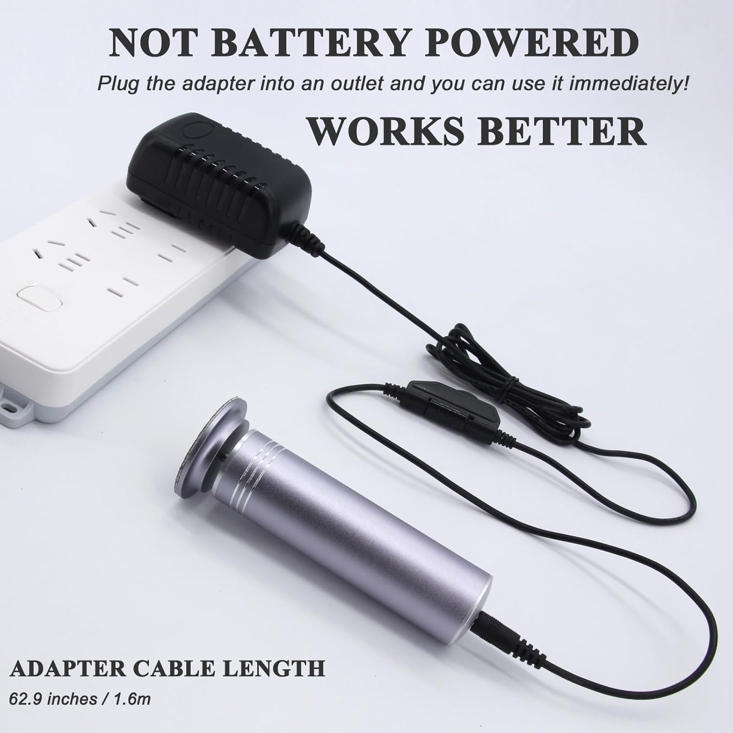 - NOT BATTERY POWERED, STRONG POWER: The electric callus remover is not battery powered, don't worry about low battery issues when using it. You just need to plug the adapter into an outlet and you can use the electric foot file right away.
