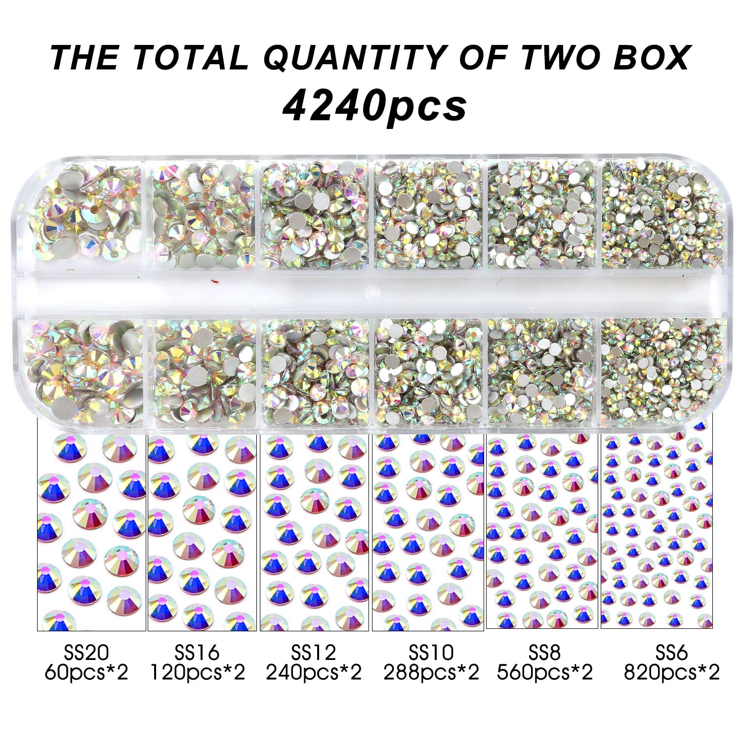 - 💎Product Packaging: Box Packaging SS6 2MM - 1680 Pcs, SS8 2.4MM - 1120 Pcs, SS10 2.8MM - 600 Pcs, SS12 3MM - 480 Pcs, SS16 4MM - 240 Pcs, SS20 4.8MM - 120 Pcs, 1 pcs Tweezers and 1 pcs Picking Pen.