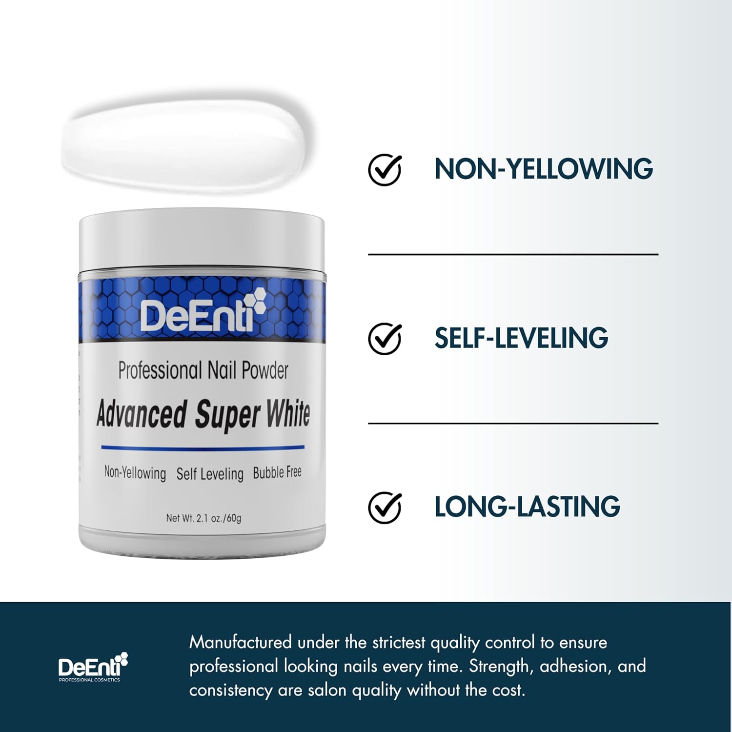 - NON-YELLOWING & SELF LEVELING formula creates smooth, shiny nails without excessive filing and prep. Manufactured under the strictest quality control to ensure professional looking nails every time. Strength, adhesion, and consistency are salon quality without the cost.