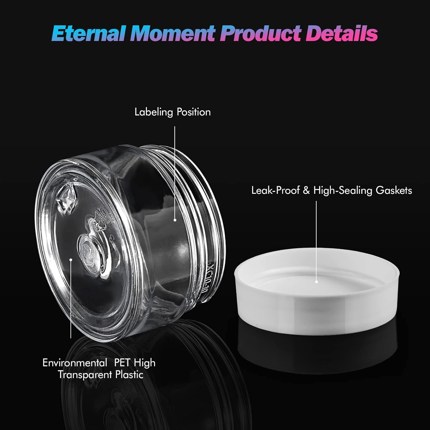 - ★【PERFECT SIZE】: SIZE:1.97 inch diameter by 1.23 inch tall. Capacity: 1 OZ(30ml). Portable to take and fit perfectly into your tote bags, backpack or gym bag. You can take them go anywhere. Eternal Moment mini cosmetic containers can also be stored on a shelf or displayed to promote a professional ambiance.