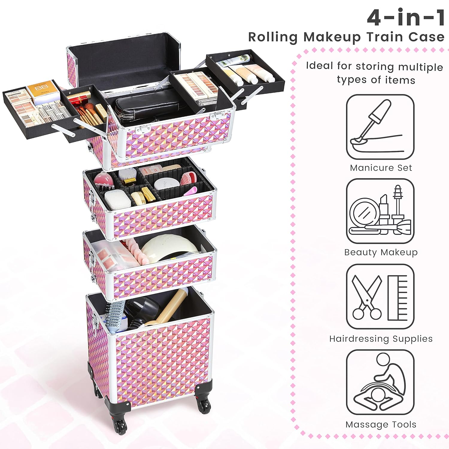 Yaheetech 4 in 1 Professional Makeup Train Case/Rolling Cosmetic Trolley/Makeup Case Organizer/Makeup Travel Case with 4 Detachable Swivel Wheels, Glitter Pink