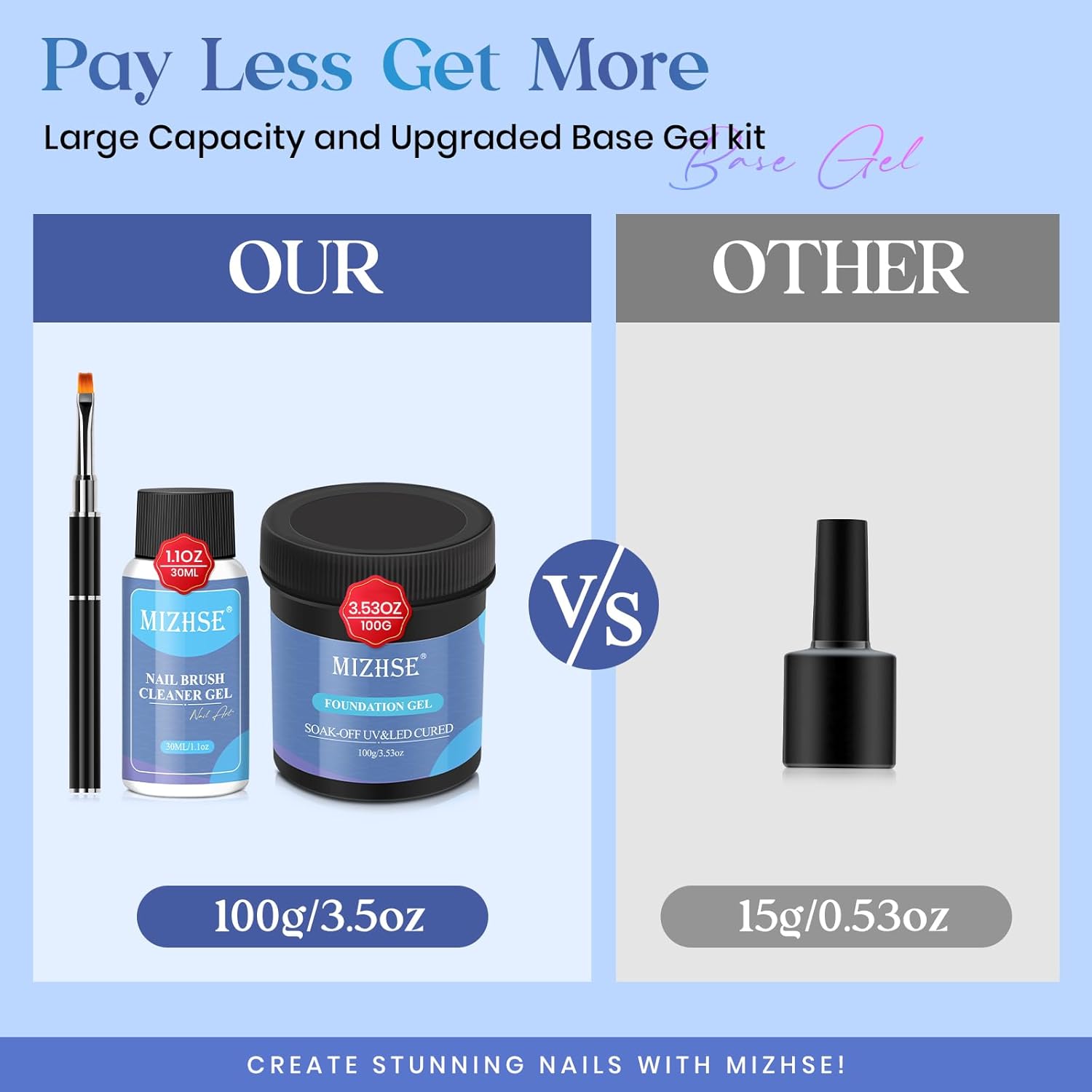 - Lager Capacity Gel Base Coat: MIZHSE's upgraded 3.5 oz/100ml base coat nail polish kit with 70% more capacity than other brands, can be used 250+ times, and is great value for money. This Base Coat Nail Polish kit includes a 100ml base coat, 30 ml brush Cleaner Gel, and Nail Art Brush. Pay less and get more