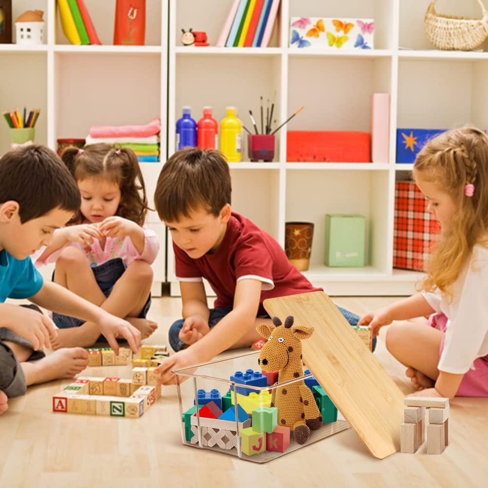 Hudgan 4 Pack Clear Plastic Storage Bins with Bamboo Lids, Stackable Storage Containers for Organizing Medicine Cabinet Organizer, Craft Room, Bread Box