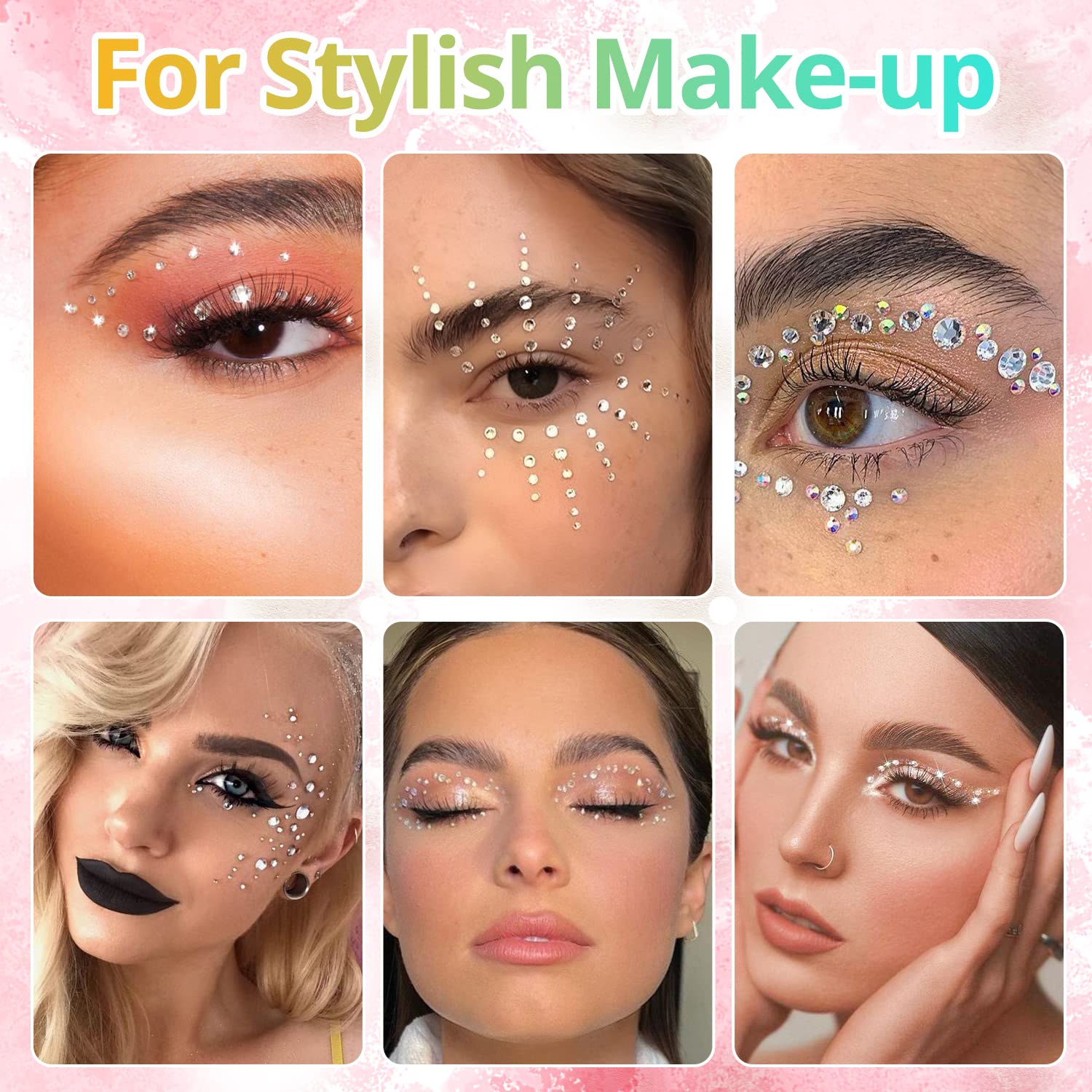 - 💎CONVENIENT MAKEUP GLUE -- The equipped glue is quick dry and do not need UV curing. The viscosity is moderate that is enough to secure the gems to your skin and is easy to remove. You can use it to apply face gems, chunky glitter and false eyelash.