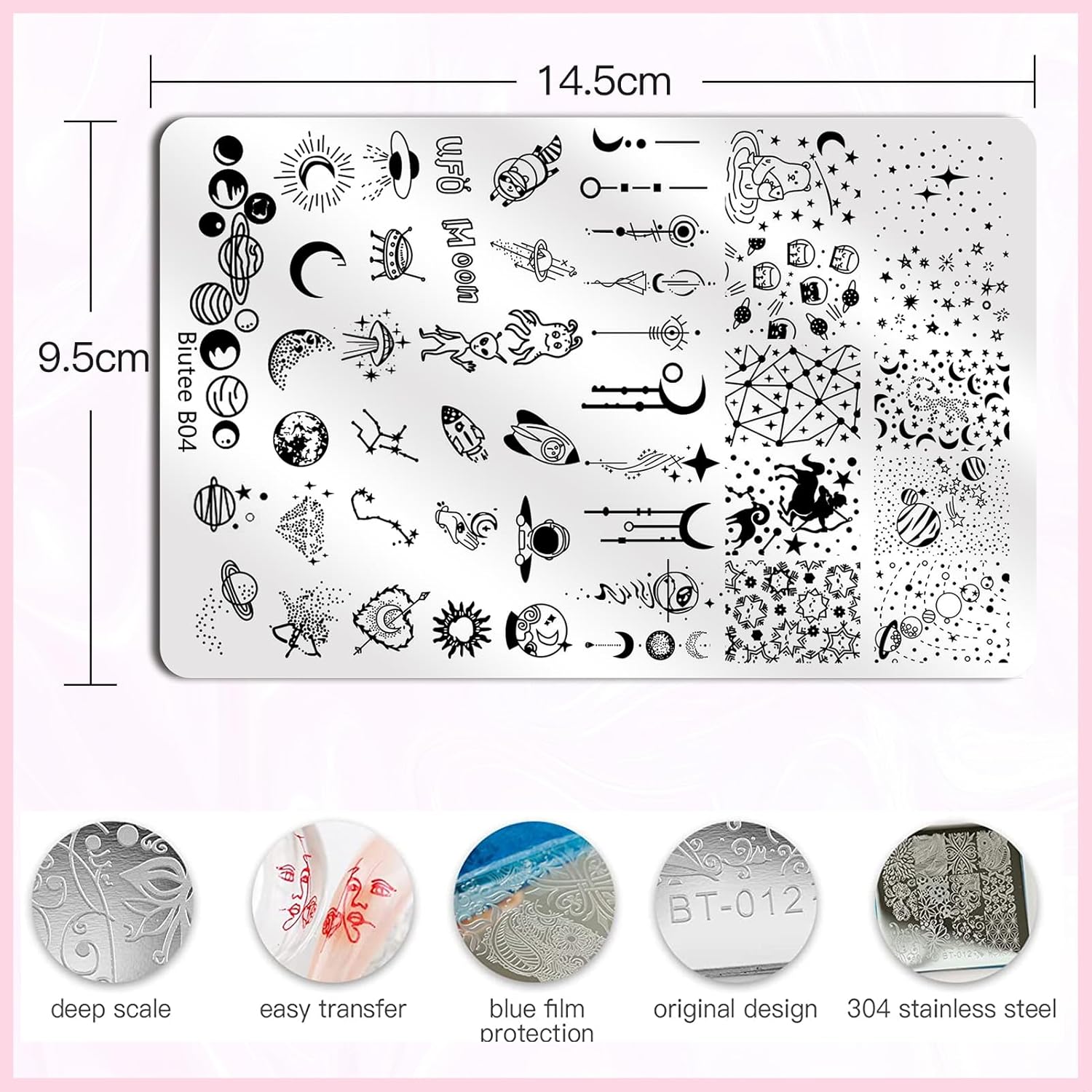 Biutee 4PCS Nail Stamping Plates Set, Includes Nail Art Stamper & Scraper - French Line Lace, Space, Animal, Flower, Leaf Designs - Large Nail Art Stencils Templates for DIY Manicure