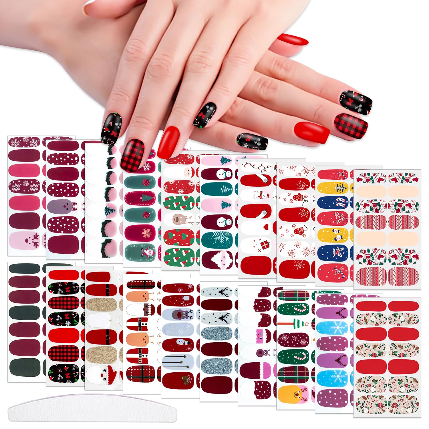 WOKOTO 20pcs Christmas Nail Polish Stickers - Full Nail Wraps, Holiday Nail Art Strips with 280 Tips - Christmas Tree, Socks, Elk, Snow Designs Stickers for Women Girls Nails Gel Strips Wraps