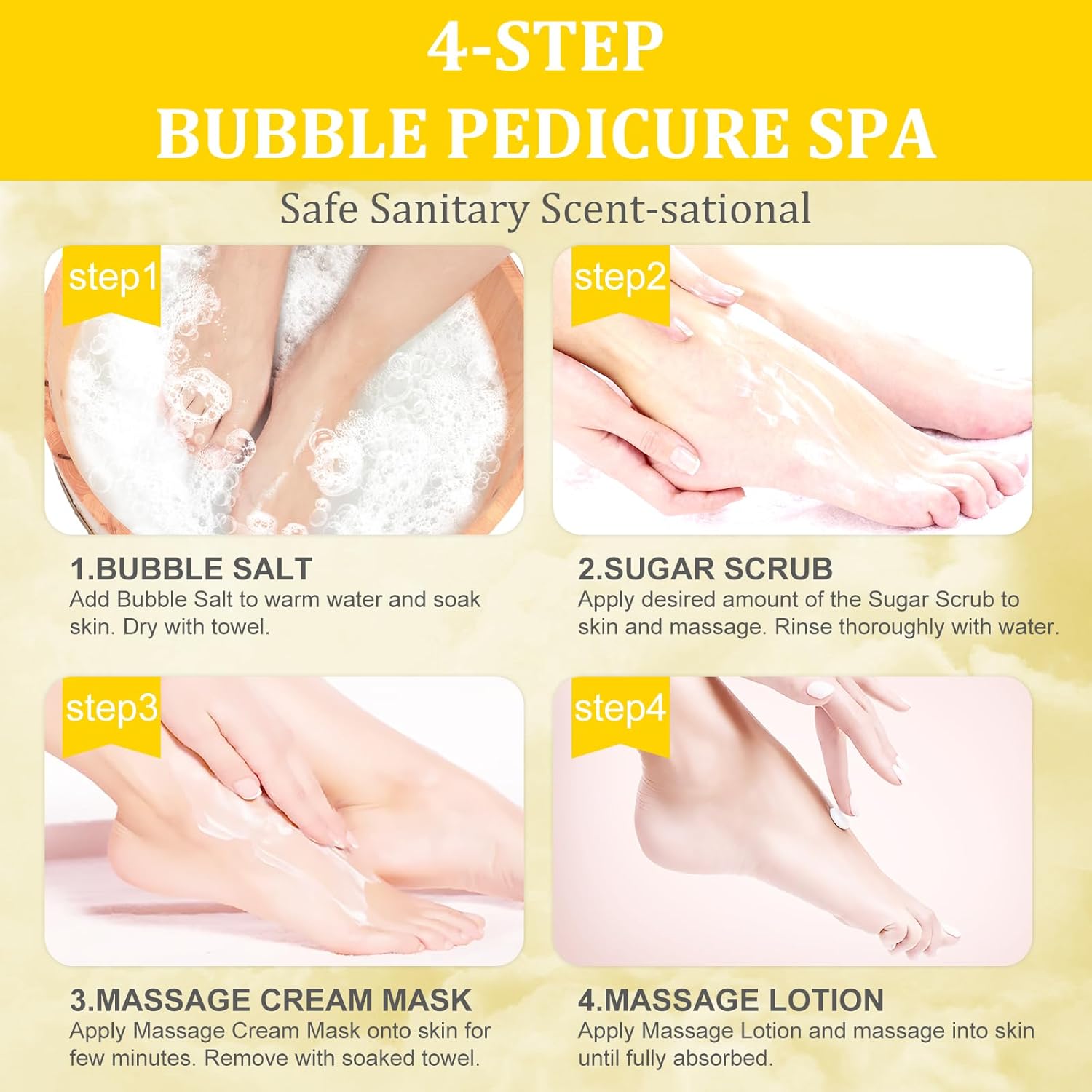 - ❀[Package Includes]: Exfoliating Foot Spa Pedicure Kit consists of 3* Bubble Salt, 3*Sugar Scrub, 3*Massage Mask, and 3*Massage Lotion for a 4-step foot spa at home. Formated to be gentle on the skin, you are sure to feel your skin feeling soft and supple after use.