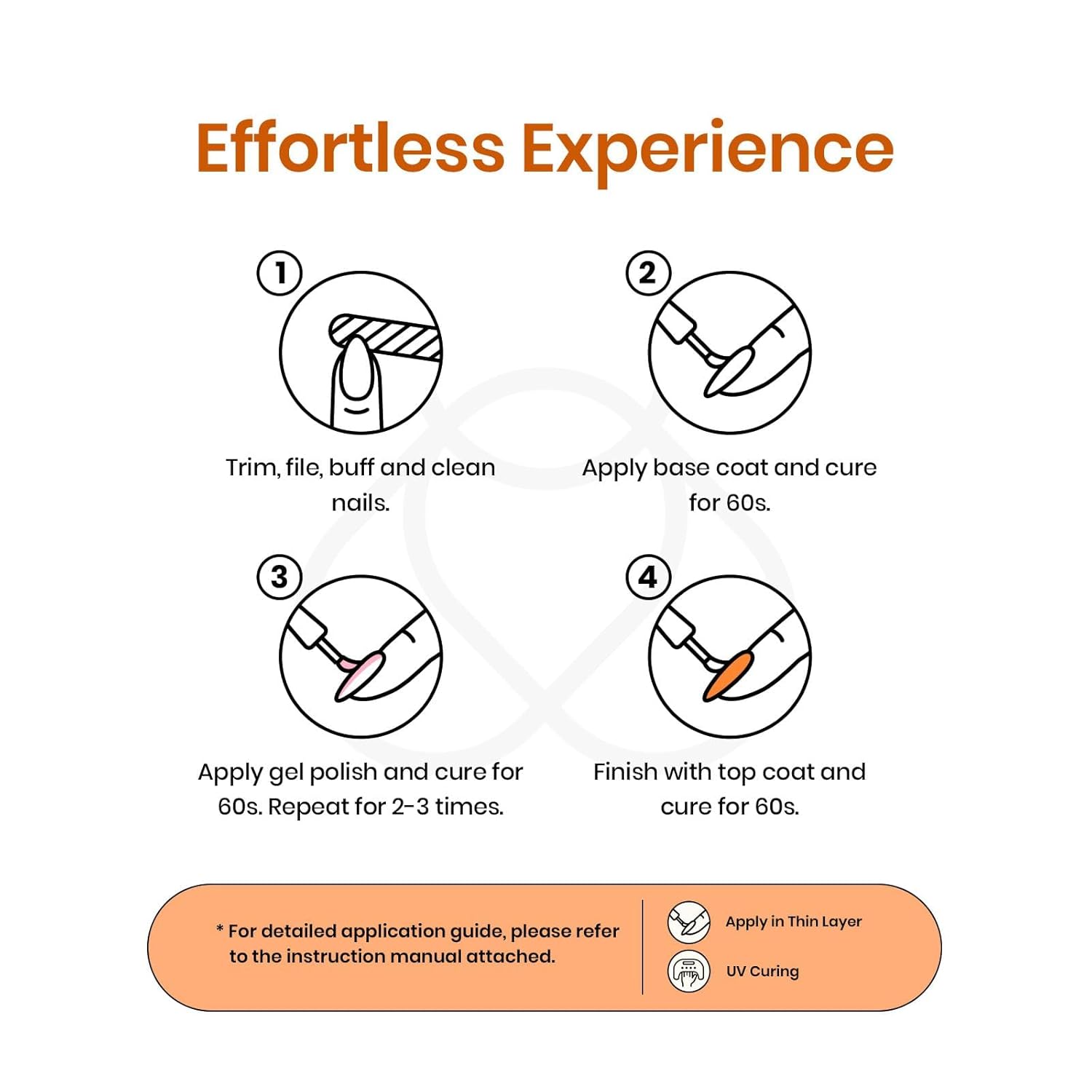 - Reminder: Cure under LED light for 90-120 secs. Base and Top coat required.If gel feels thick or tacky, place in hot water for 1-2 minutes, remove from water and shake well.