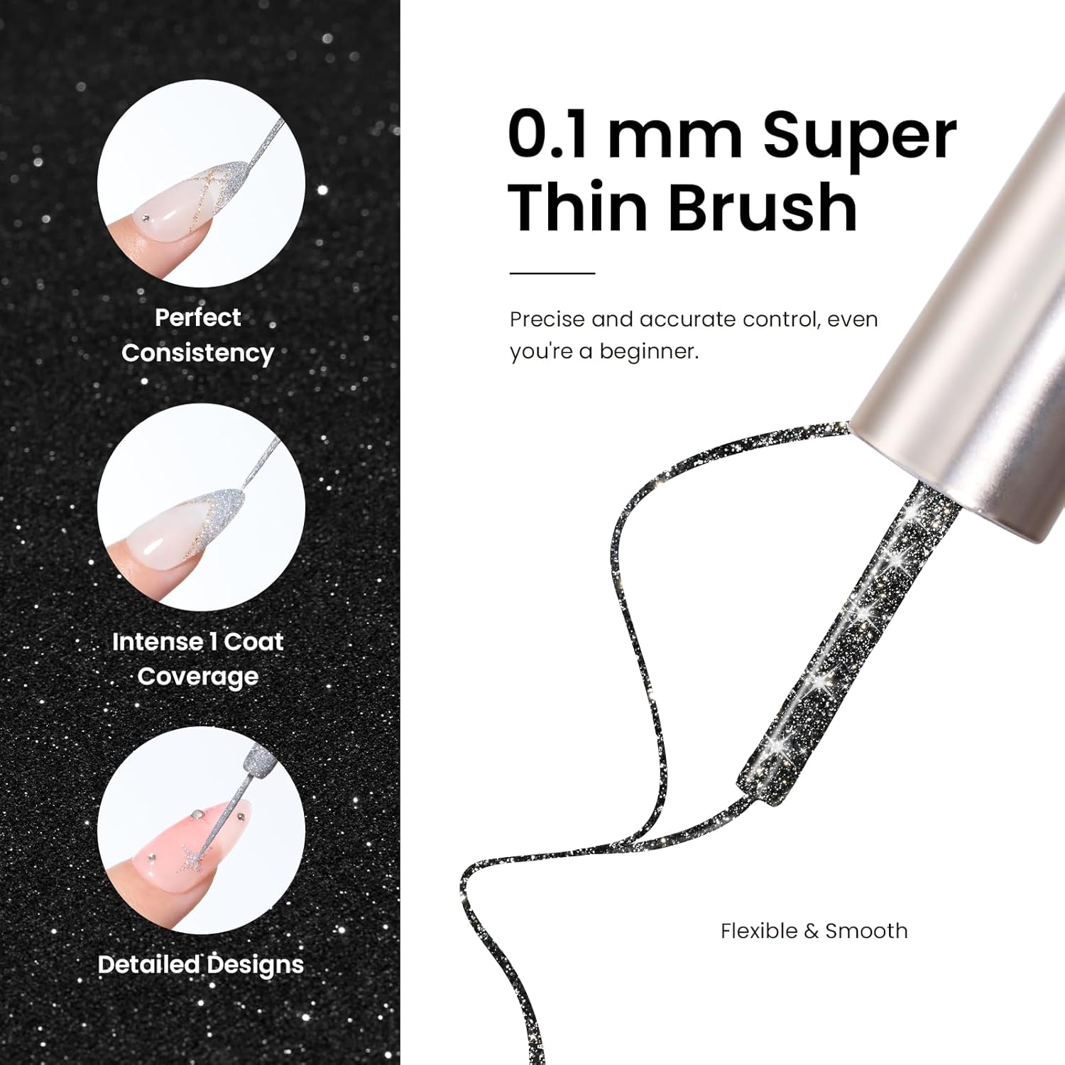 Beetles Reflective Glitter Gel Polish, 2 Pcs Liner Gel Nail Polish Set Black Silver Nail Art Gel Glitter Gel Nail Polish Diamond Shinning Liner Nail Art Design Gifts for Women New Trend