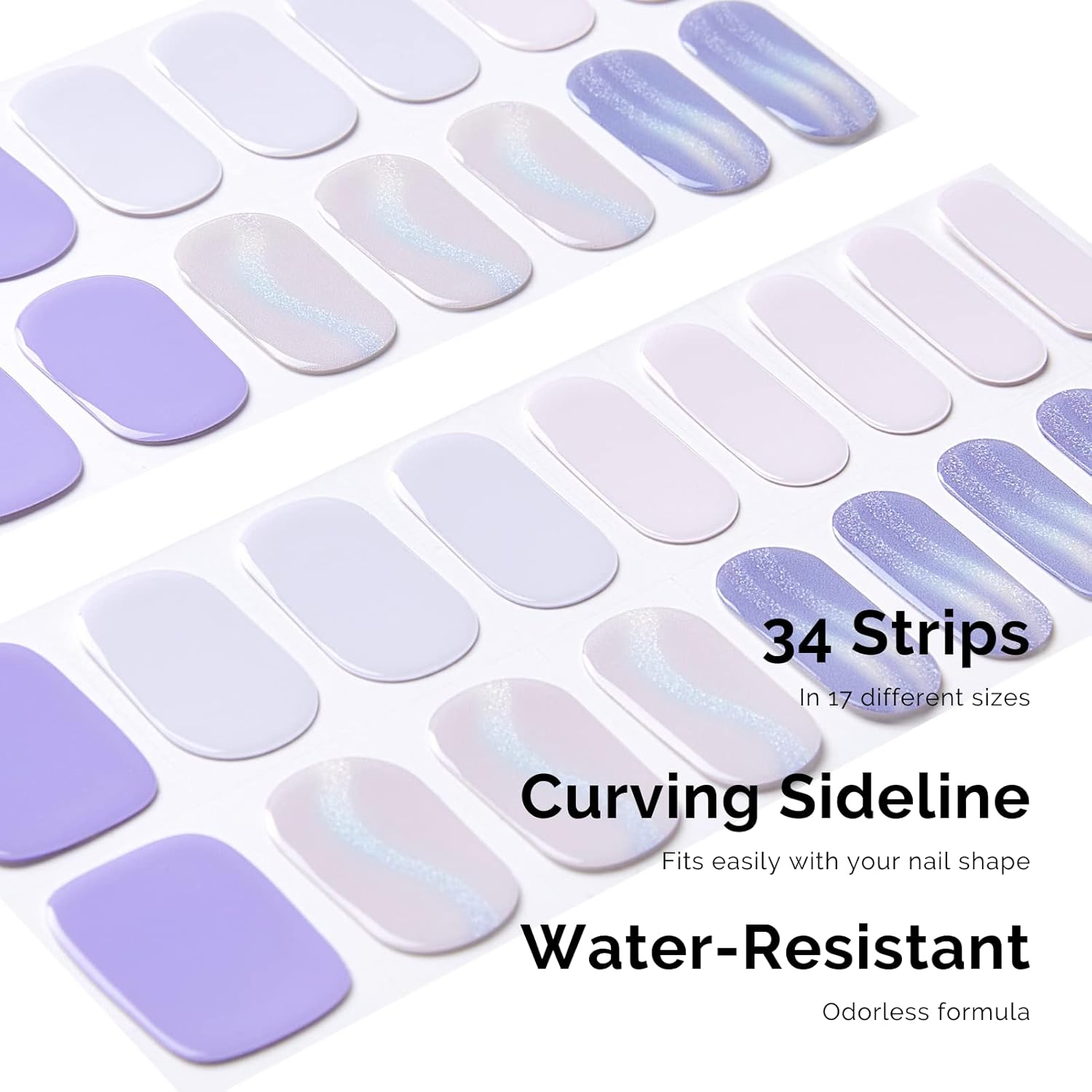 - ăWHAT YOU GETă34 Pieces gel polish strips in 17 sizes, 2 prep pads, 1 nail file, and 1 wooden stick. -Our semi cured nail strips are free from toxic, animal-derived, or harmful ingredients and are vegan, safe to use, and odorless. A perfect cost & time-saving DIY manicure kit.