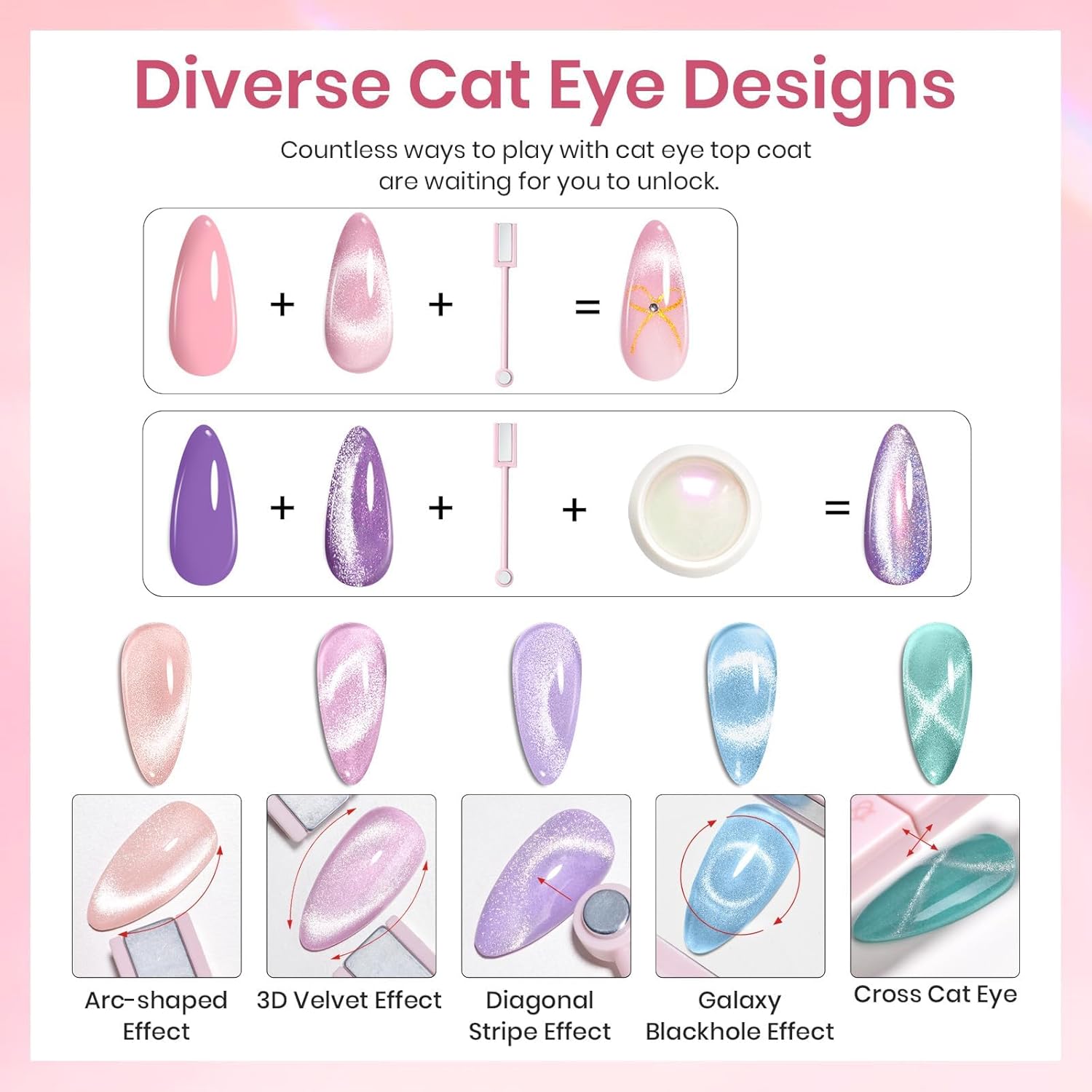 - 【Long Lasting Shine】: Enjoy long-lasting, chrome-like/ shimmer-like shine for 28+ days with proper application and curing under an LED lamp. Say goodbye to chips and scratches! Cure times vary per lighting system,we recomand cure for 60-120s. Tips for Cat Eye Gel Polish: Place the magnetic stick over the surface about 3-5mm for 5-10 secs to get your desired effect!!!!