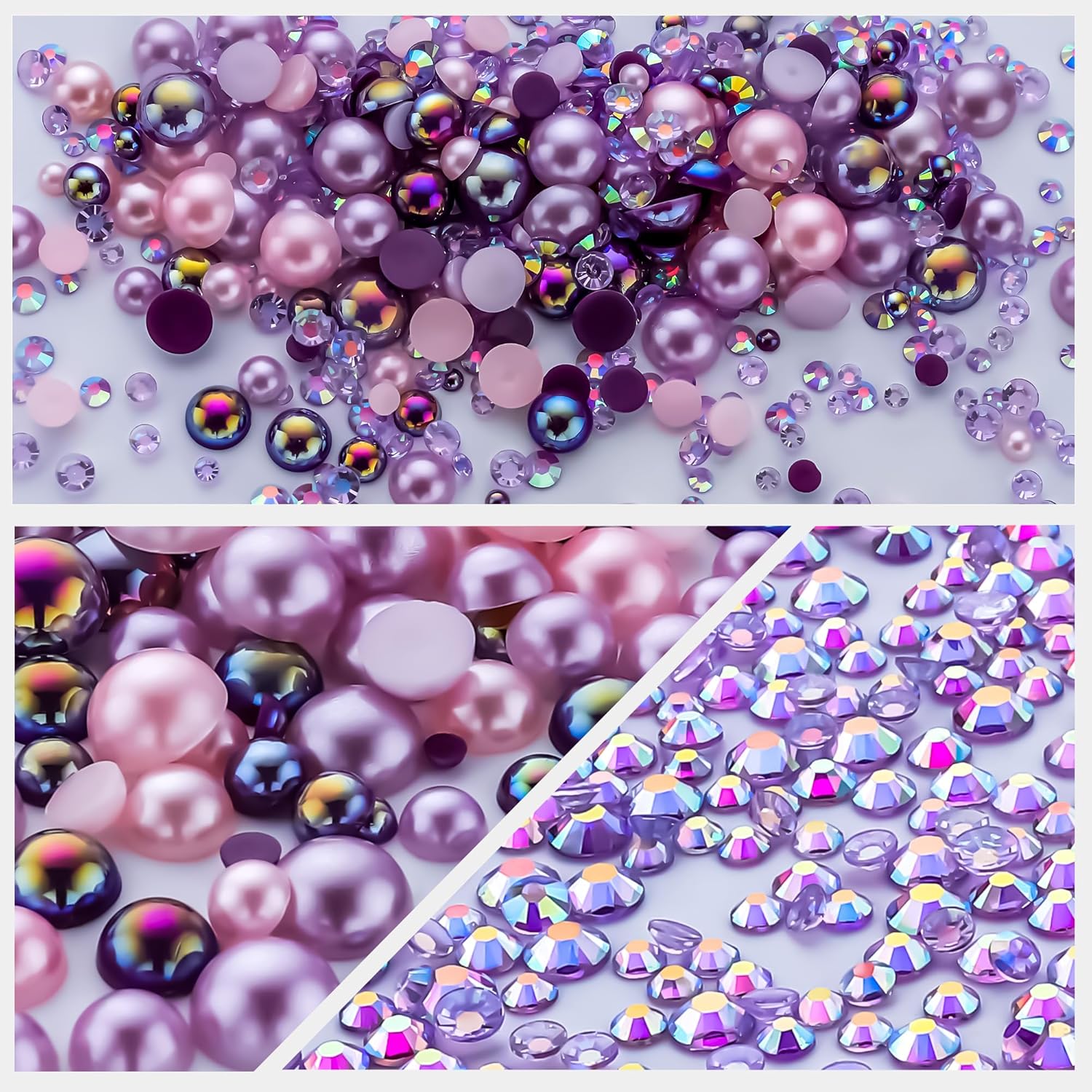 60g Light Amethyst Pearls Rhinestones for Crafts Mixed Size 3mm-10mm AB Color Round Half Pearls Flatback Pearl Beads and Resin Rhinestones Set for Face Art with Gel Gel