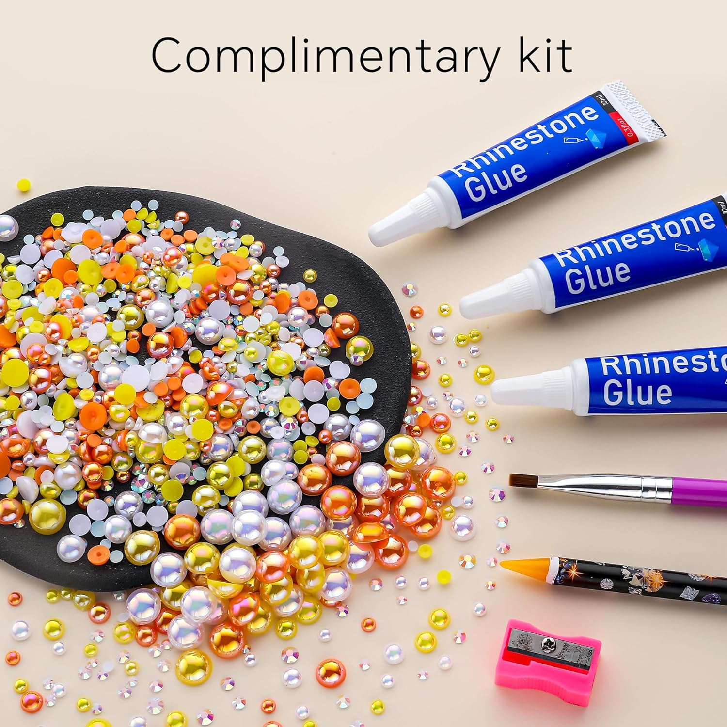 - What You Will Receive: 60g(30g*2)mixed size flat back pearls and rhinestones. 3*Rhinestone Glue. 1* wax pencil for rhinestones. 1*Pencil sharpener(color random). The mix half round pearls and rhinestones can make more beautiful handicrafts for your friends, parents, yourselfs on any festivals.If you need a mixed size pack of pearl rhinestones, search on Amazon:B0BBL1KVMD