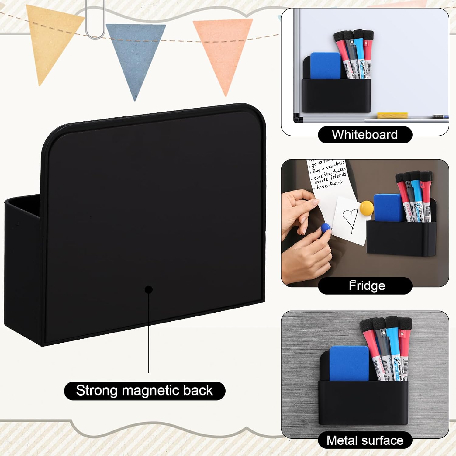 - Widely Applicable: board marker holders are suitable for storing markers, pencils, pens, notes and other office supplies, they can be applied in offices and schools; In addition, they can be attached to most metal or magnetic surfaces, such as refrigerators, metal cabinets, whiteboards, etc., which can help you to store items, save space, and keep neat
