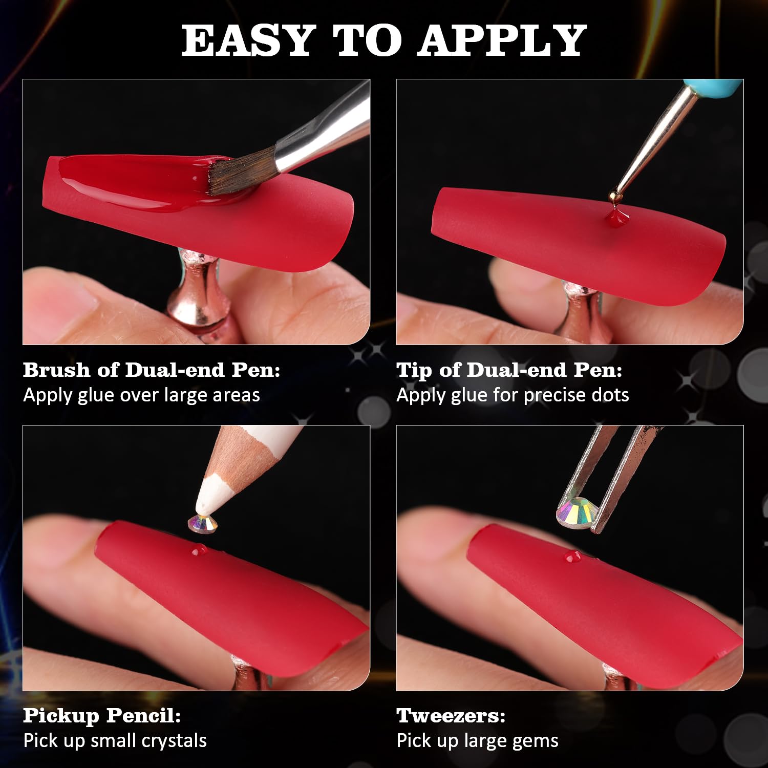 - 💎ADHESIVE GEL GLUE: The crystal clear nail gem glue uses a special, non-toxic and eco-friendly formula with strong tackiness, adhesion, and fluidity for easily applying decorations. It is a type of UV gel glue. After proper curing under a UV/LED lamp, the glue dries clear with superior bonding strength that can last weeks without falling off. With the designed tip, you can easily and conveniently apply the glue to the nail bed or the surface of false nails.