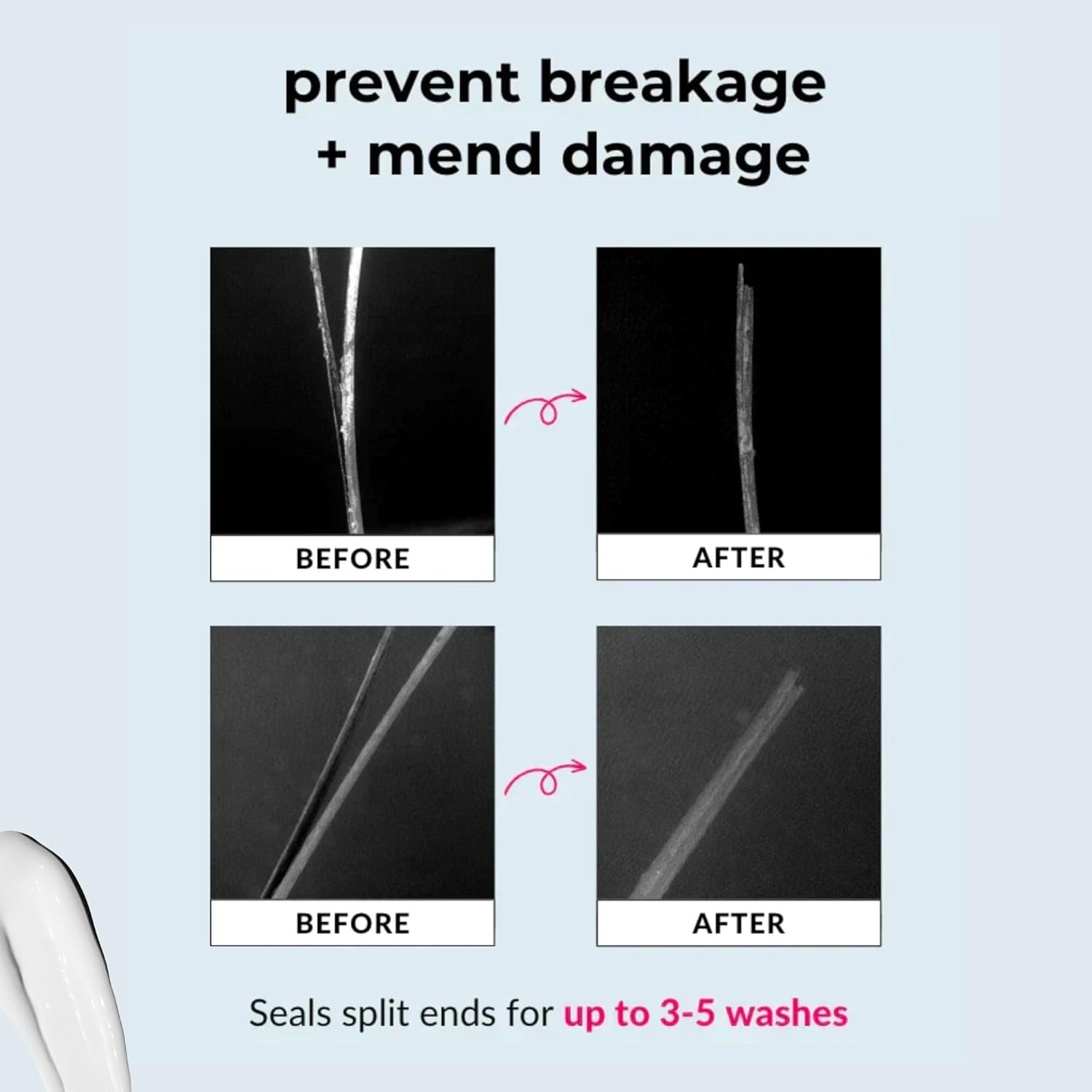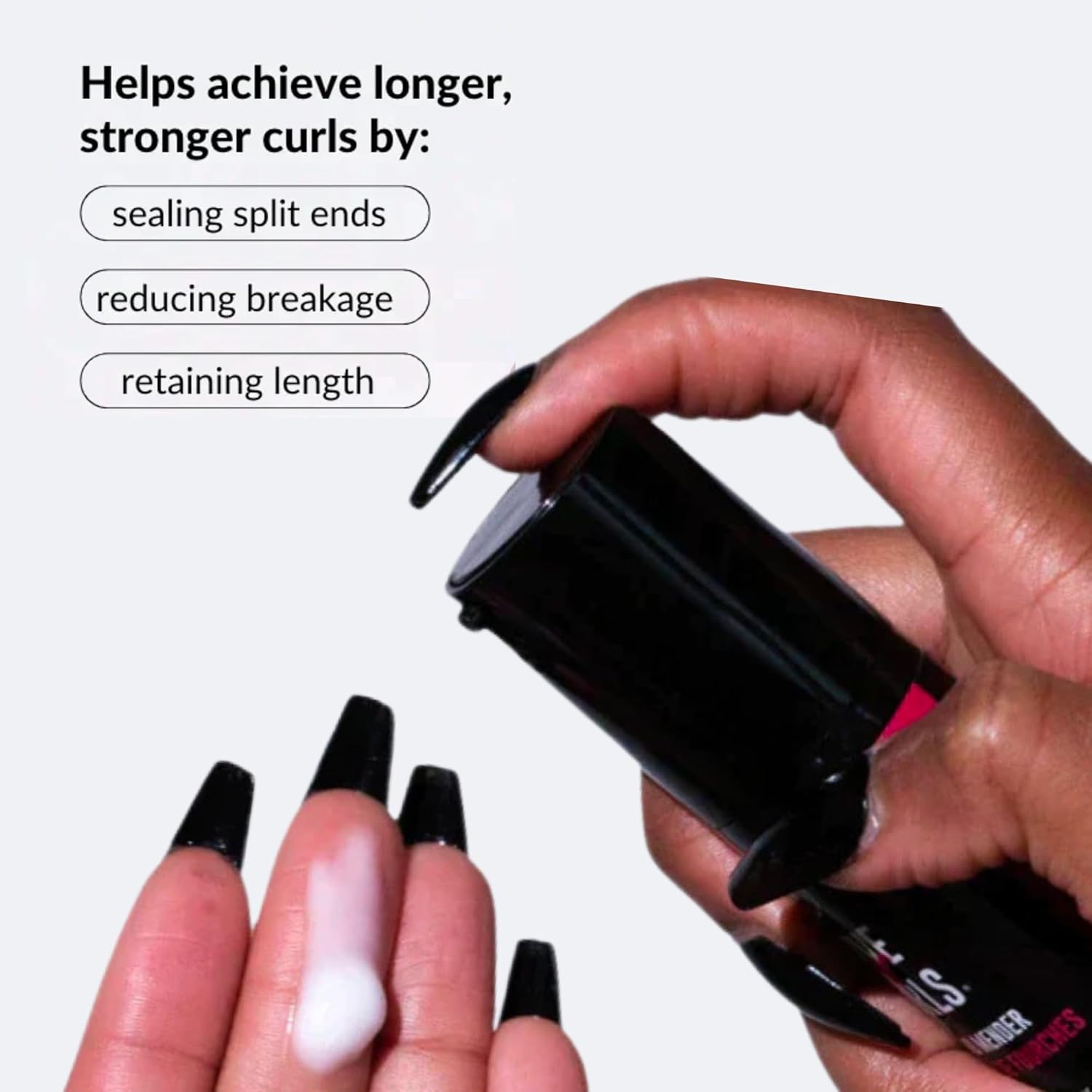 - Longer, Stronger Curls: By sealing split ends for up to 3-5 washes it minimizes the appearence of existing damage and prevents splits from travelling up the hair shaft. This not only extends the time between trims but also reduces the amount of damage that would typically get trimmed off.