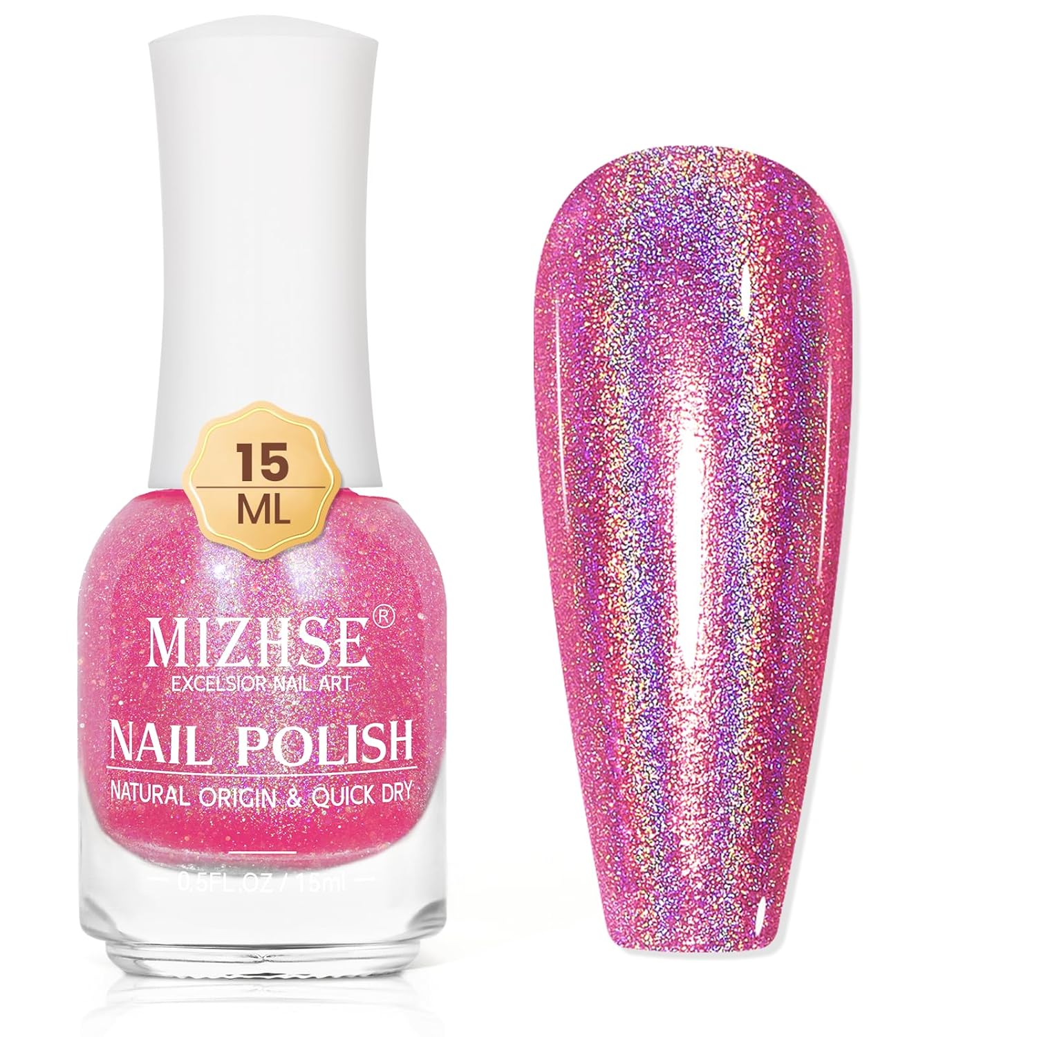- MIZHSE Holographic Nail Polish: 15 ml (0.5 fl oz) holographic nail polish. The nail polish is high pigmented that makes the nails shine like rainbow. Can get different holographic rainbow effects based on different lights and viewing angles. Professional nail polish for infinite styles. Iridescent nail polish is suitable for use with any color nail polish you like as base color.