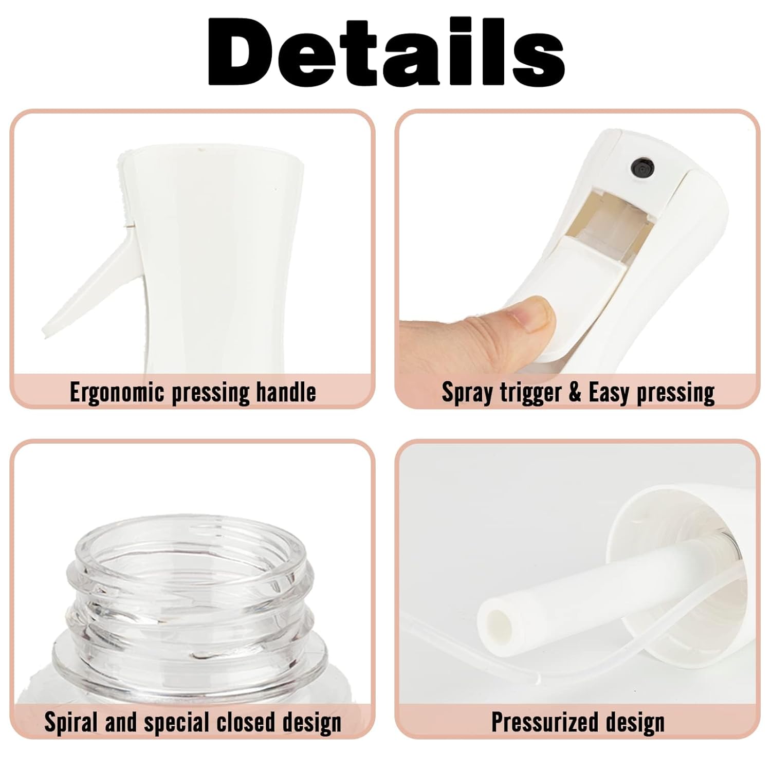 - 【High Quality】The continuous mist spray bottle is made of quality PET material with advanced technology, strong and not easily dented, durable and refillable. BPA-free, no smell, no leakage, and refillable. If anything goes wrong with your continuous spray bottle, please contact us directly.