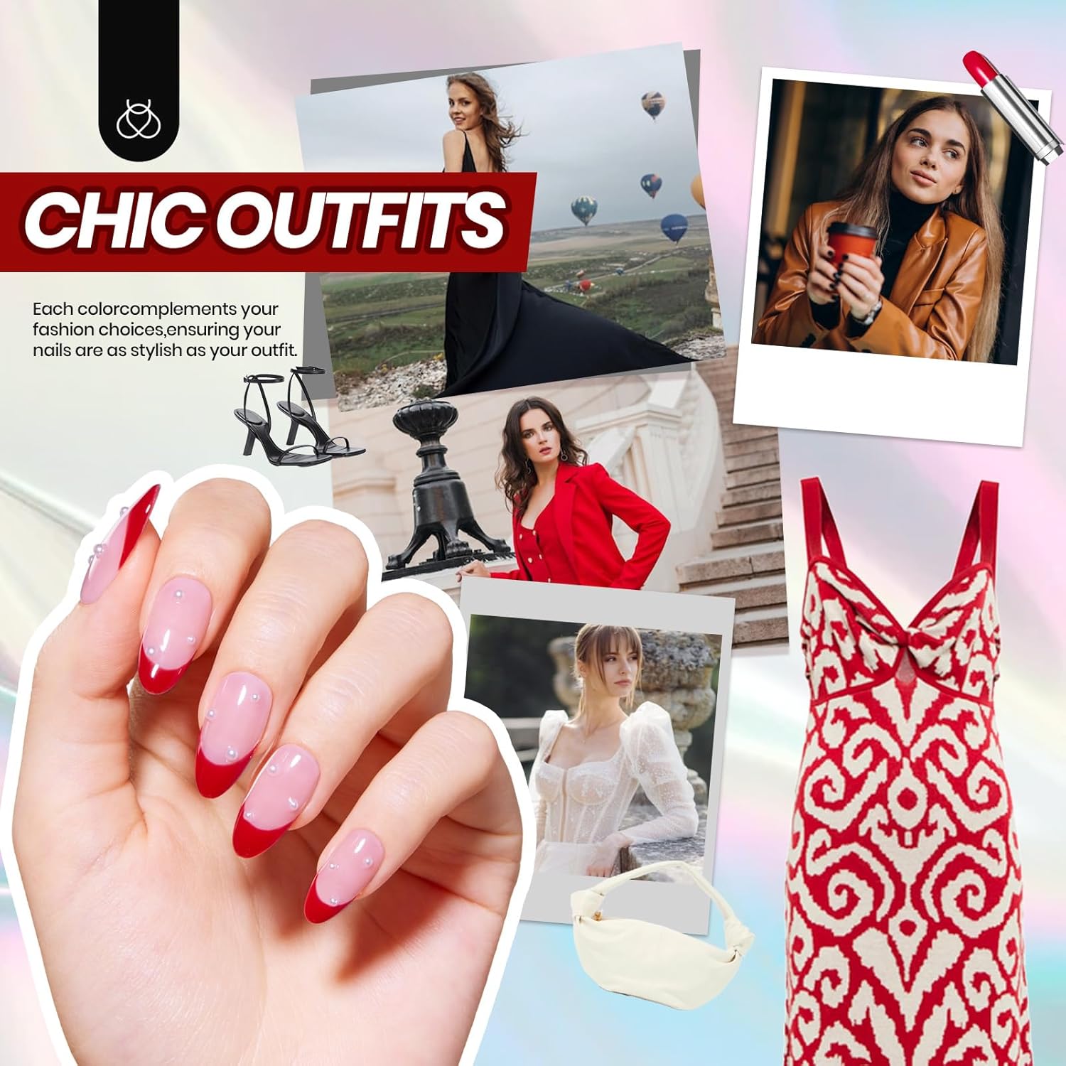 - 【Easy to Use】Quick manicure, this valentines gel nail kit contains 2*french stickers and 2*nail gems, which can quickly create beautiful nails. At the same time, it is also easy to remove nail polish, just put a little acetone on the foil cotton pad and wrap your nails/fingers. Wait for a few minutes, the gel nail polish will fall off immediately. It is best to use our Cuticle pusher to remove it (the kit does not include acetone, you need to buy it yourself)