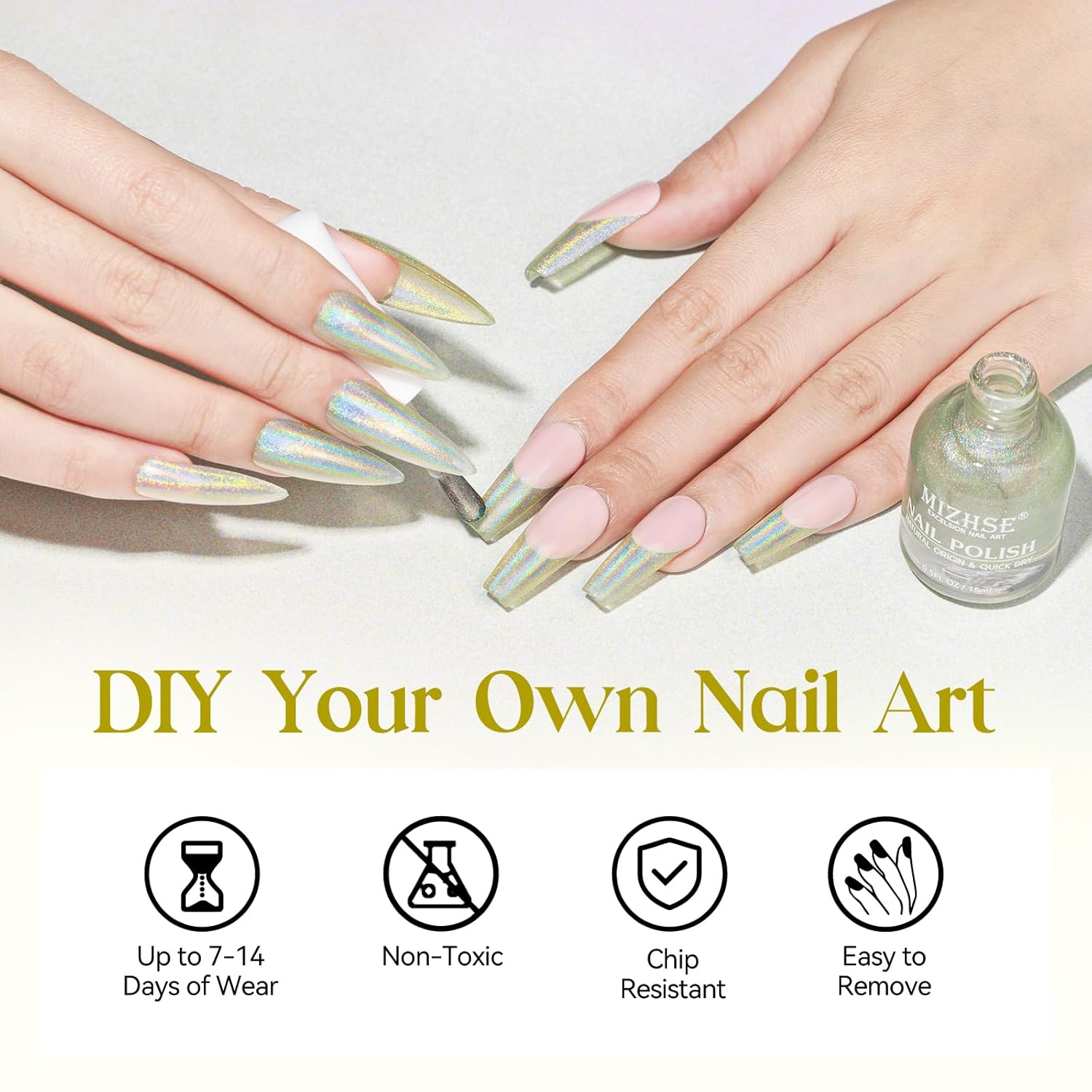 - MIZHSE Holographic Nail Polish: 15 ml (0.5 fl oz) holographic nail polish. The nail polish is high pigmented that makes the nails shine like rainbow. Can get different holographic rainbow effects based on different lights and viewing angles. Professional nail polish for infinite styles. Iridescent nail polish is suitable for use with any color nail polish you like as base color.
