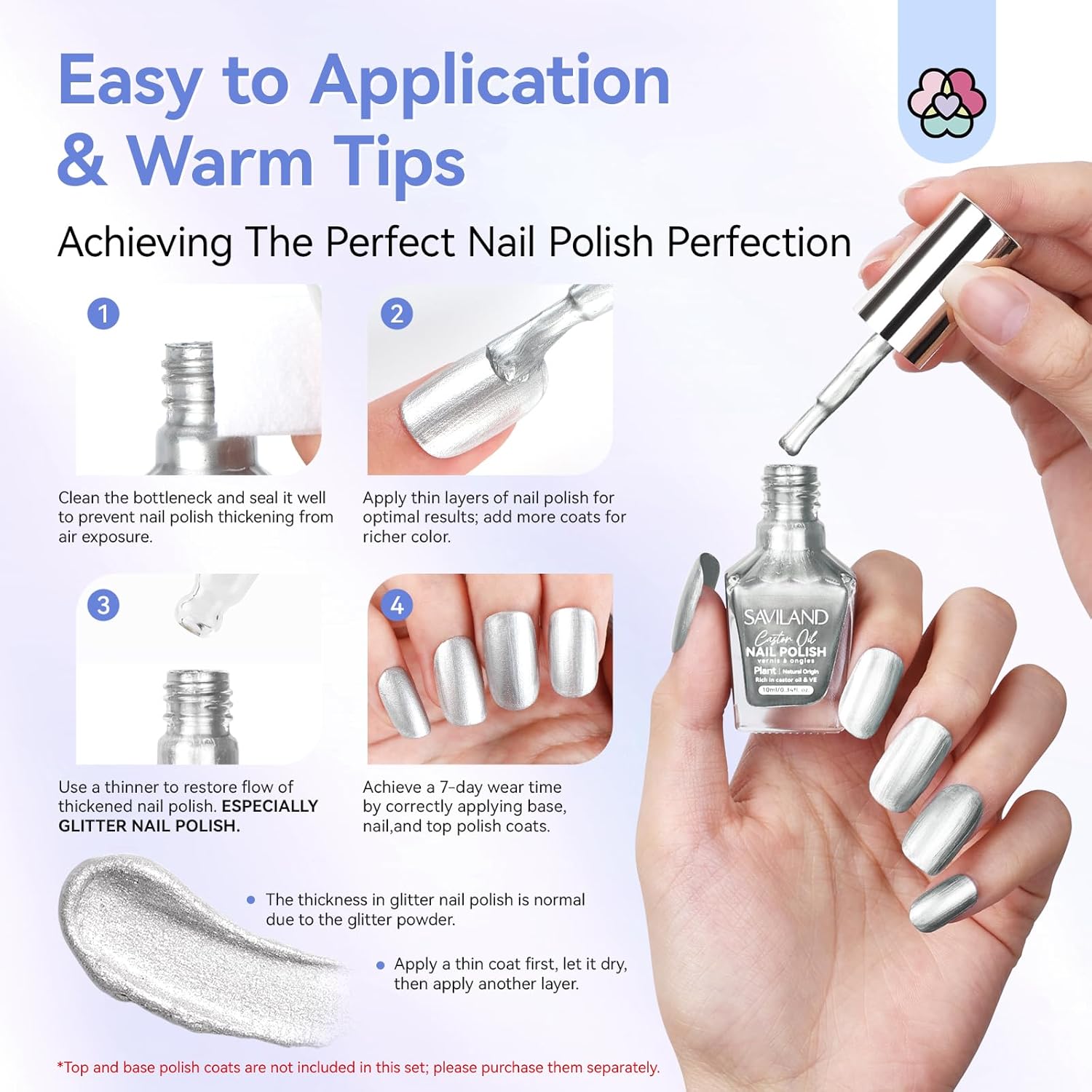 - Air Quick Drying: SAVILAND silver toe nail polish in metallic chrome dries fast, and is ideal for busy individuals seeking a quick, fashionable manicure. No nail lamp needed; simply apply and let it air dry for a few minutes