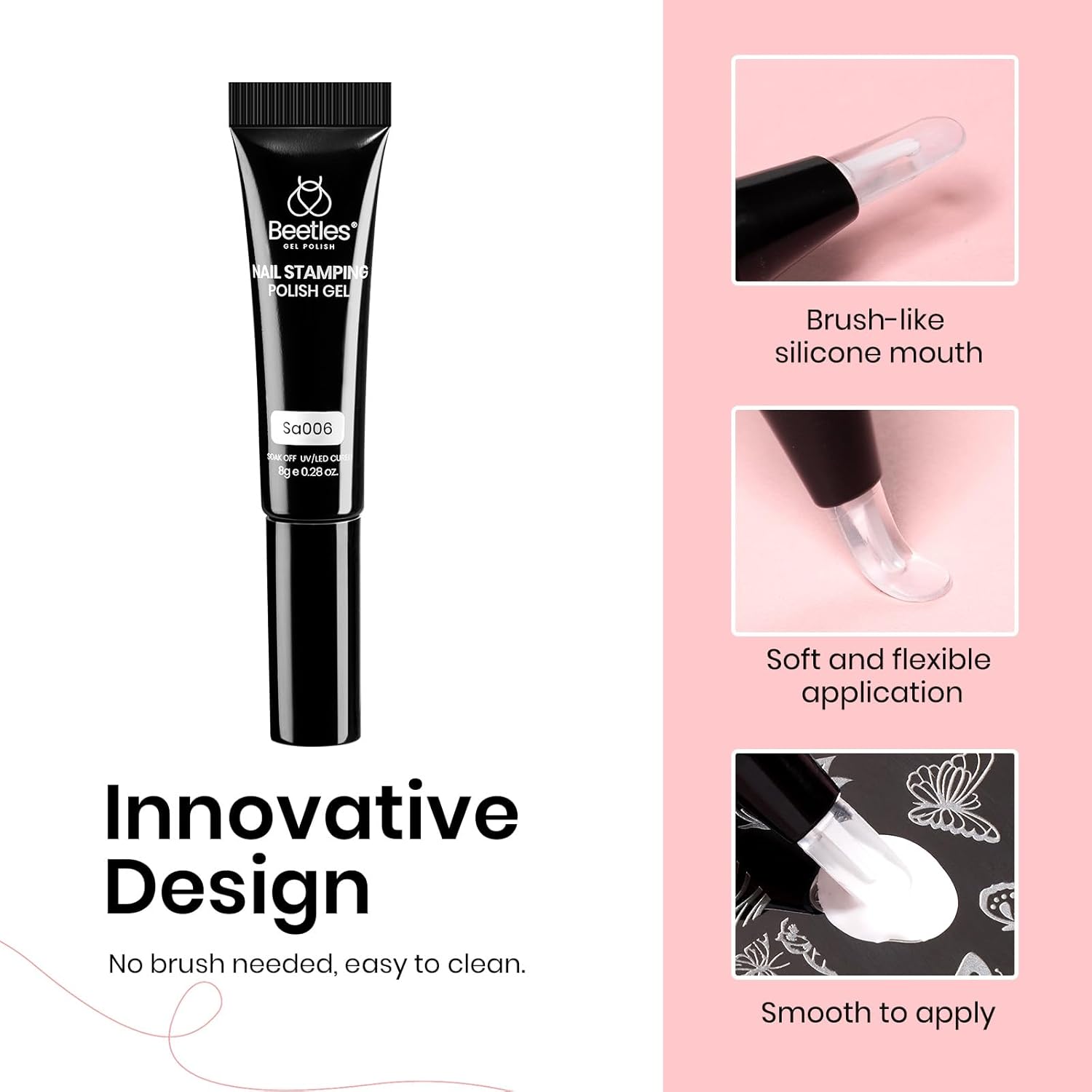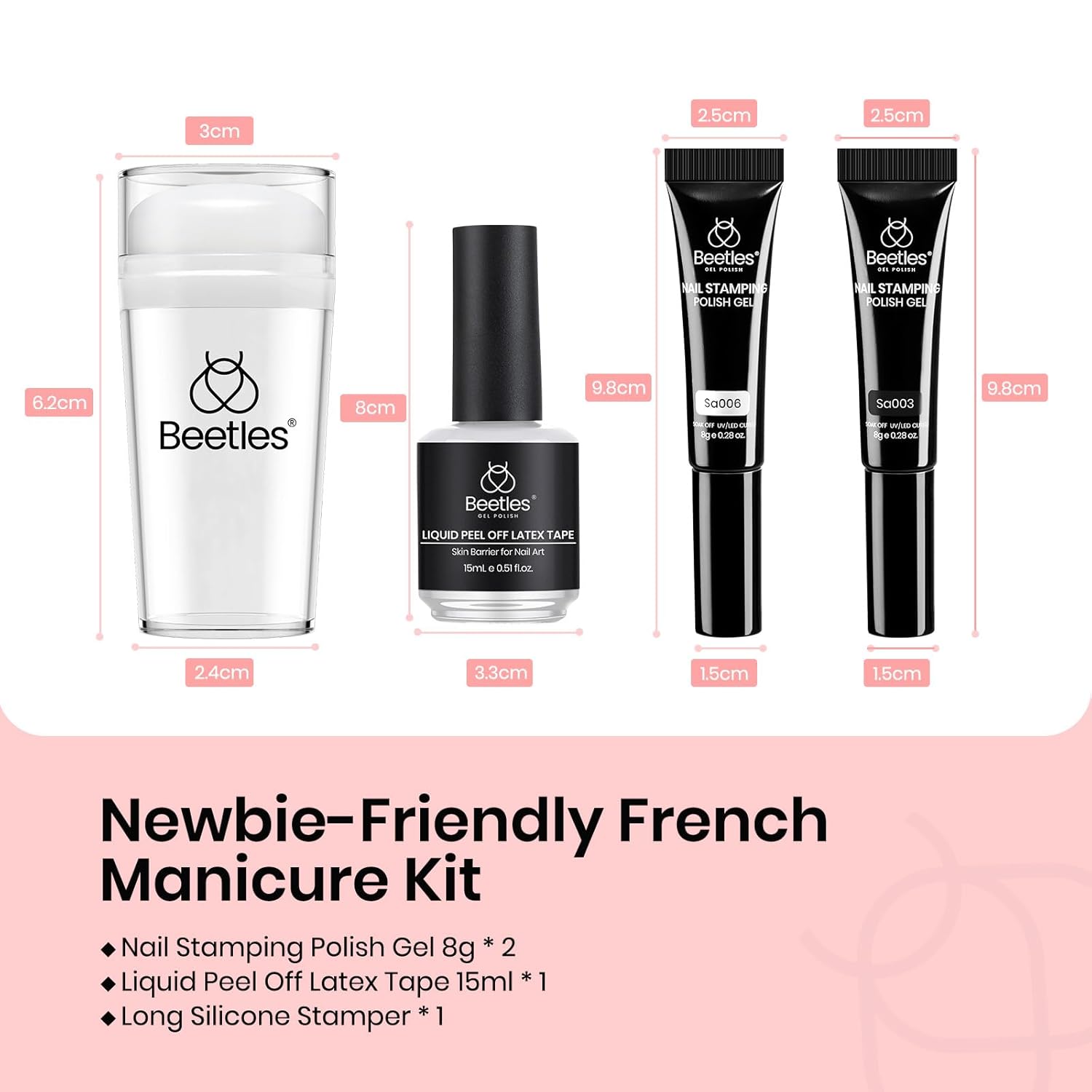 - Beetles French Tip Tool: This Stamp Gel Silicone Nail Stamp Kit, perfect for Home Manicure Diy Nail Salon, includes nail stamping polish gel 8g*2, liquid peel-off latex tape*1,long silicone stamper*1. You can take your favorite patterns on the scraper and then stamp. This nail art printing tool helps you to DIY nail art easily and quickly.