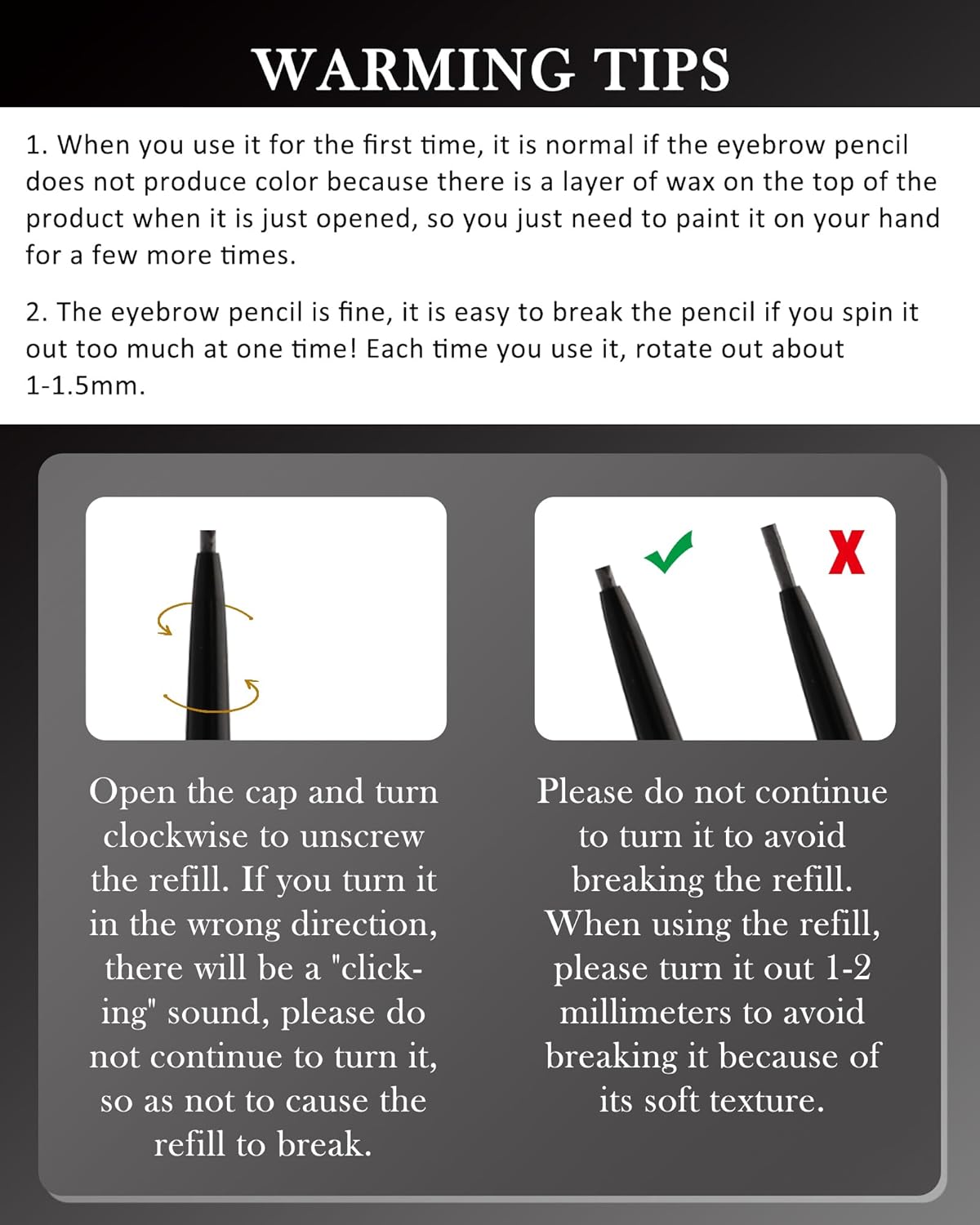 - RETRACTABLE & EASY TO USE - This retractable eyebrow pencil can be rotated out to the proper length, and to prevent accidental breakage, it is best to use it with the tip protruding less than 0.2 mm. It applies smoothly and conveniently. Ideal for makeup beginners and professionals. It is very easy to use, simply twist up the pencil slightly until the tip reaches the tip, draw small strokes and then use the brush on the other end to comb through your eyebrows and fill in sparse areas and gaps.