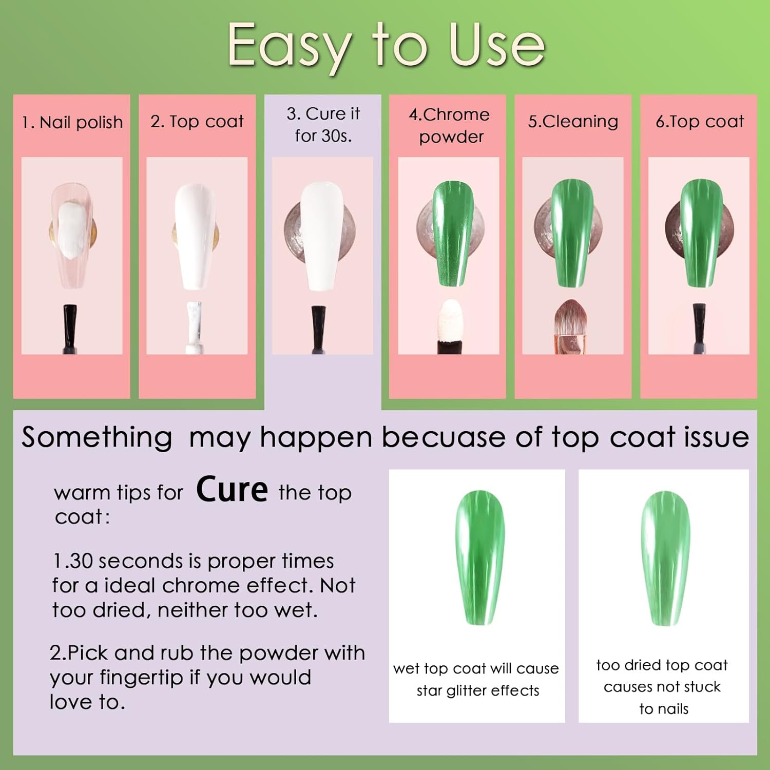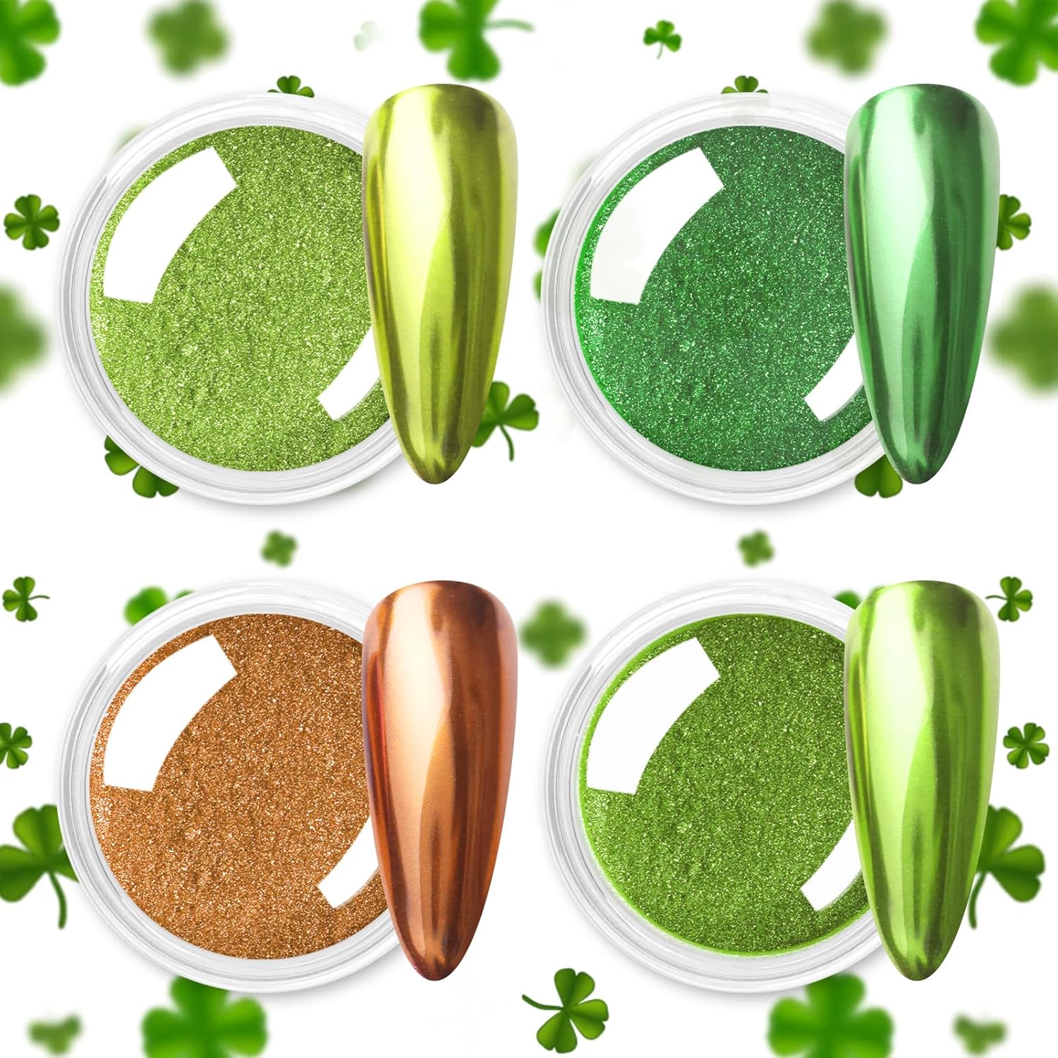 - Ultra Excellent Texture: The green chrome nail powder is fine and smooth without particles feeling, so you can make your st patrick's day nails exquisite with an amazing mirror effect. And the nail dipping powder is non-toxic, more durable, and environmentally friendly, which does not harm your nails and skin, using it more at ease. Make mirror effects for your nails with our excellent equality nail chrome powder set.