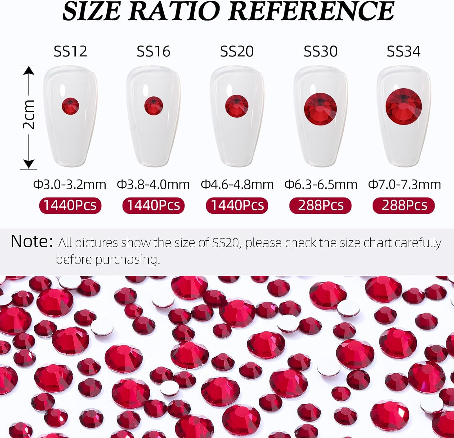 Siam Flatback Rhinestones, Glass Rhinestones for Nail Art and Craft, Glue Fix, Loose Crystal Gemstones(Siam, SS12, 1440pcs, 2.9-3.0mm)