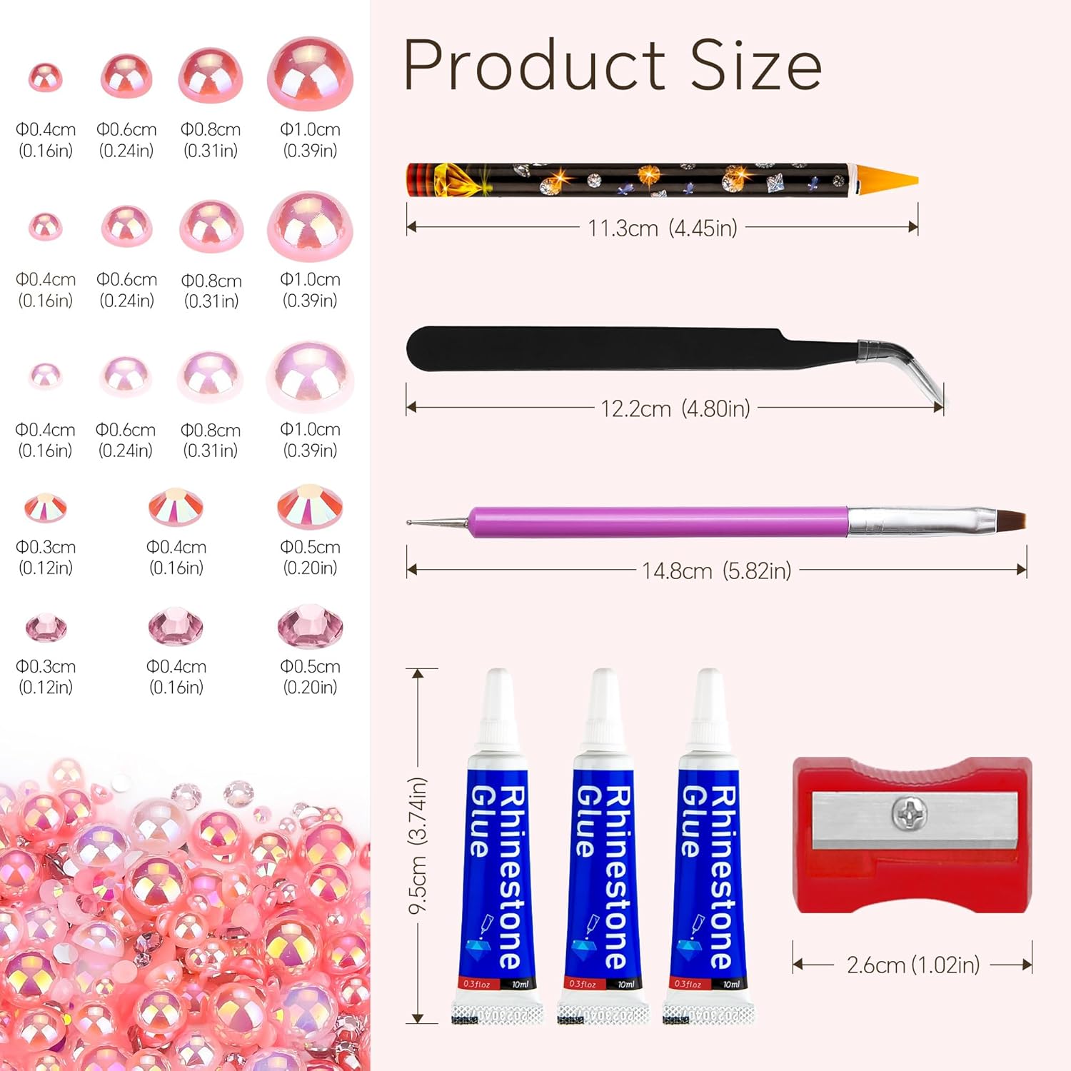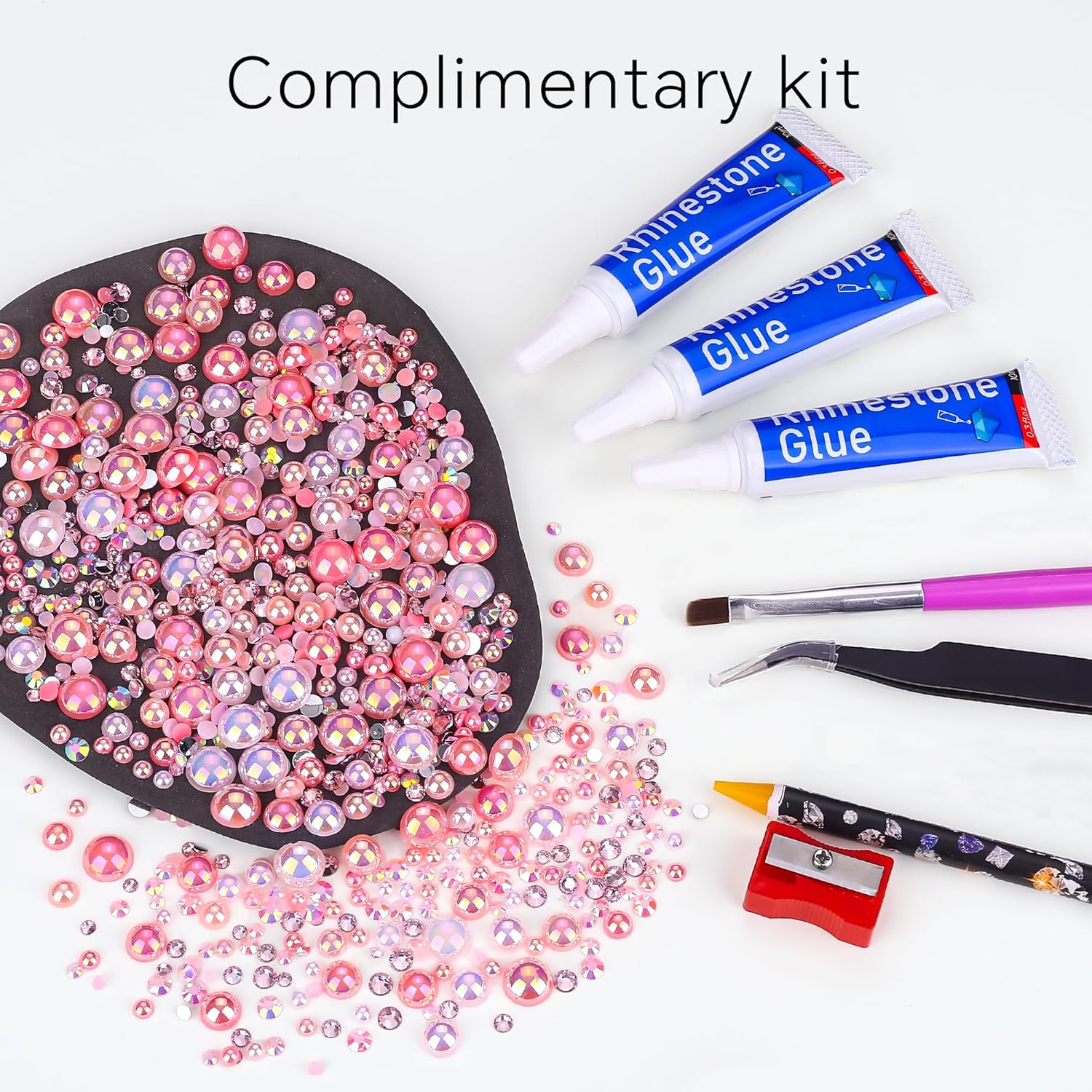 - What You Will Receive: 60g(30g*2)mixed size flat back pearls and rhinestones. 3*Rhinestone Glue. 1* wax pencil for rhinestones. 1*Pencil sharpener(color random). The mix half round pearls and rhinestones can make more beautiful handicrafts for your friends, parents, yourselfs on any festivals.If you need a mixed size pack of pearl rhinestones