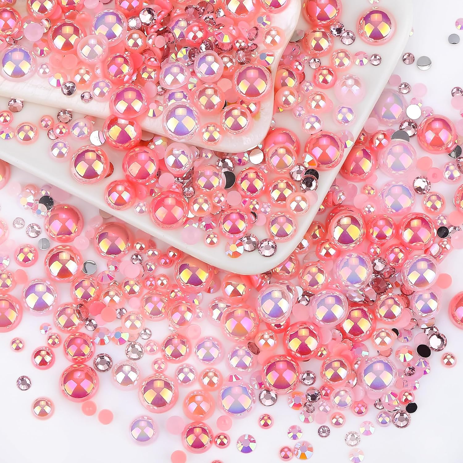 - Assortment Sizes: The flatback half pearls come in a mixture of colors and sizes of 3/4/5/6/8/10mm. The flatback rhinestones are resin rhinestones in sizes of 2/3/4/5/6mm. These mixes are such a great way to get an assortment of colors and sizes without having to buy each item individually