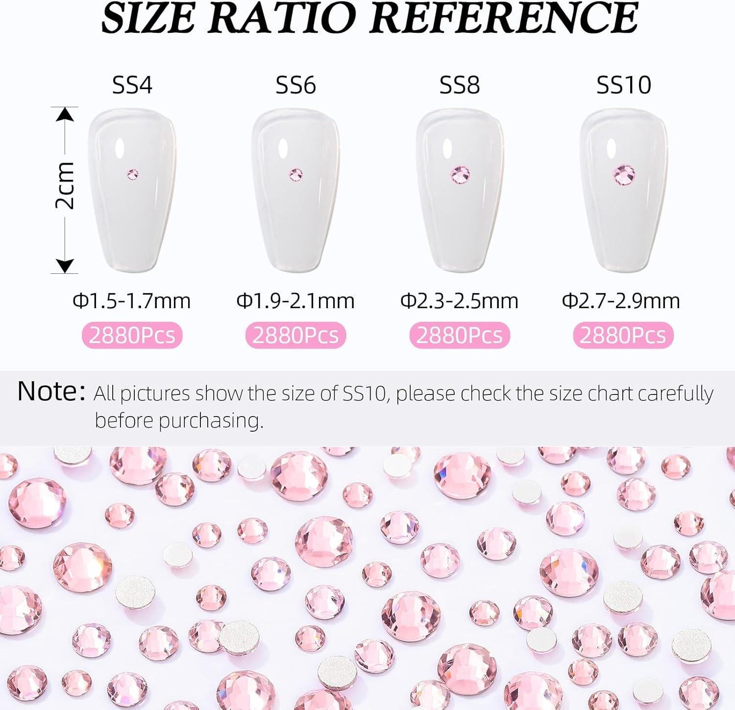 Pink Flatback Rhinestones, Glass Rhinestones for Nail Art and Craft, Glue Fix, Loose Crystal Gemstones(Pink, SS8, 2880pcs, 2.3-2.5mm)