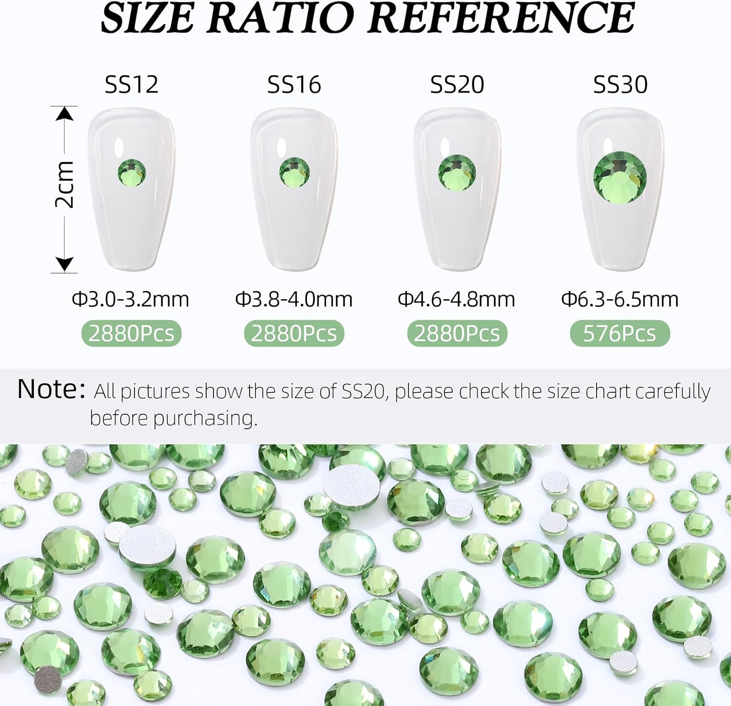 Light Green Flatback Rhinestones, Glass Rhinestones for Nail Art and Craft, Glue Fix, Loose Crystal Gemstones(Lt.Green, SS12, 2880pcs, 2.9-3.0mm)