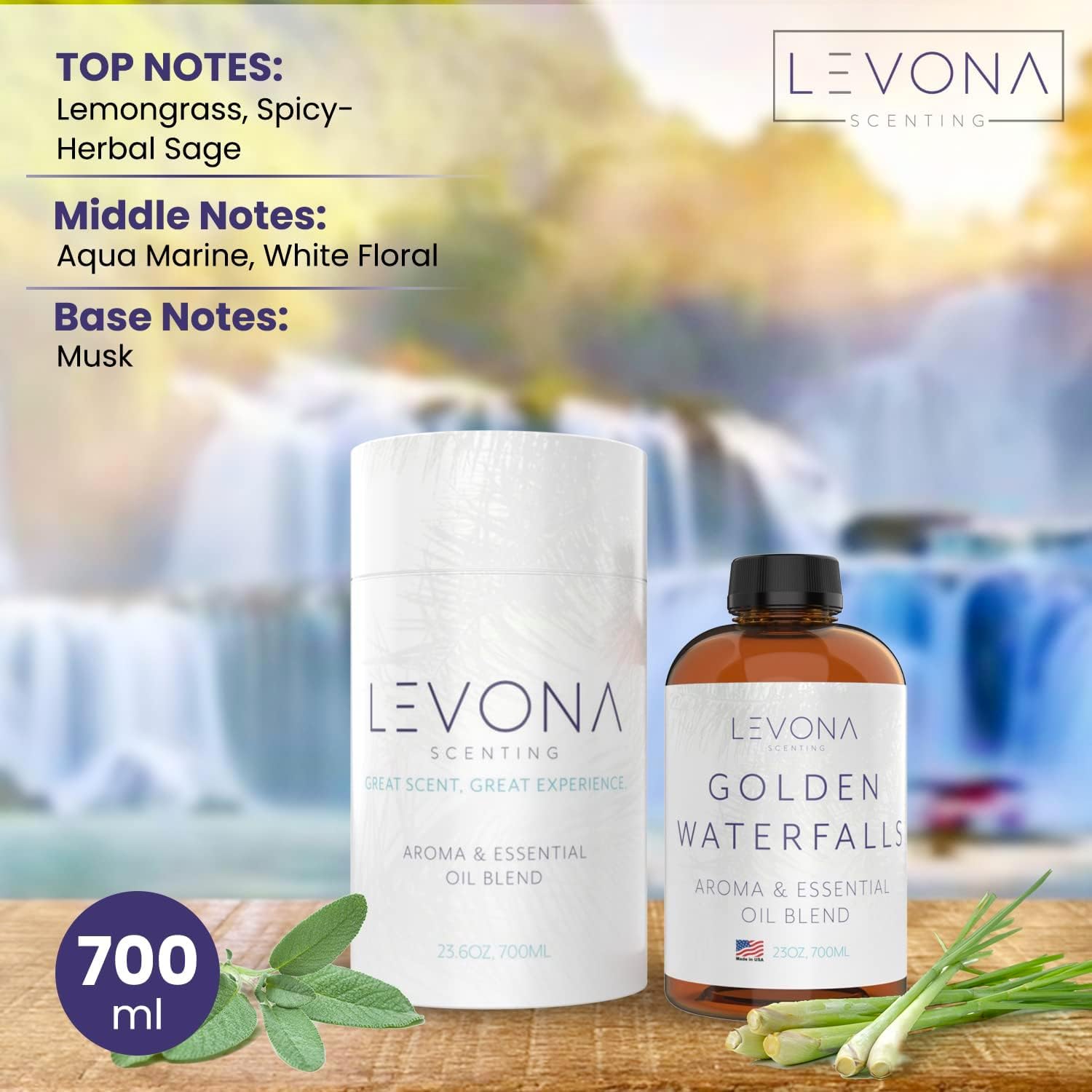 Levona Scent Pure Essential Oils for Diffusers for Home, Hotel & Office - Golden Waterfalls Essential Oils for Diffuser Oil and Humidifiers - Home Luxury Scents - Scented Fragrance Oil Blends - 700 ml