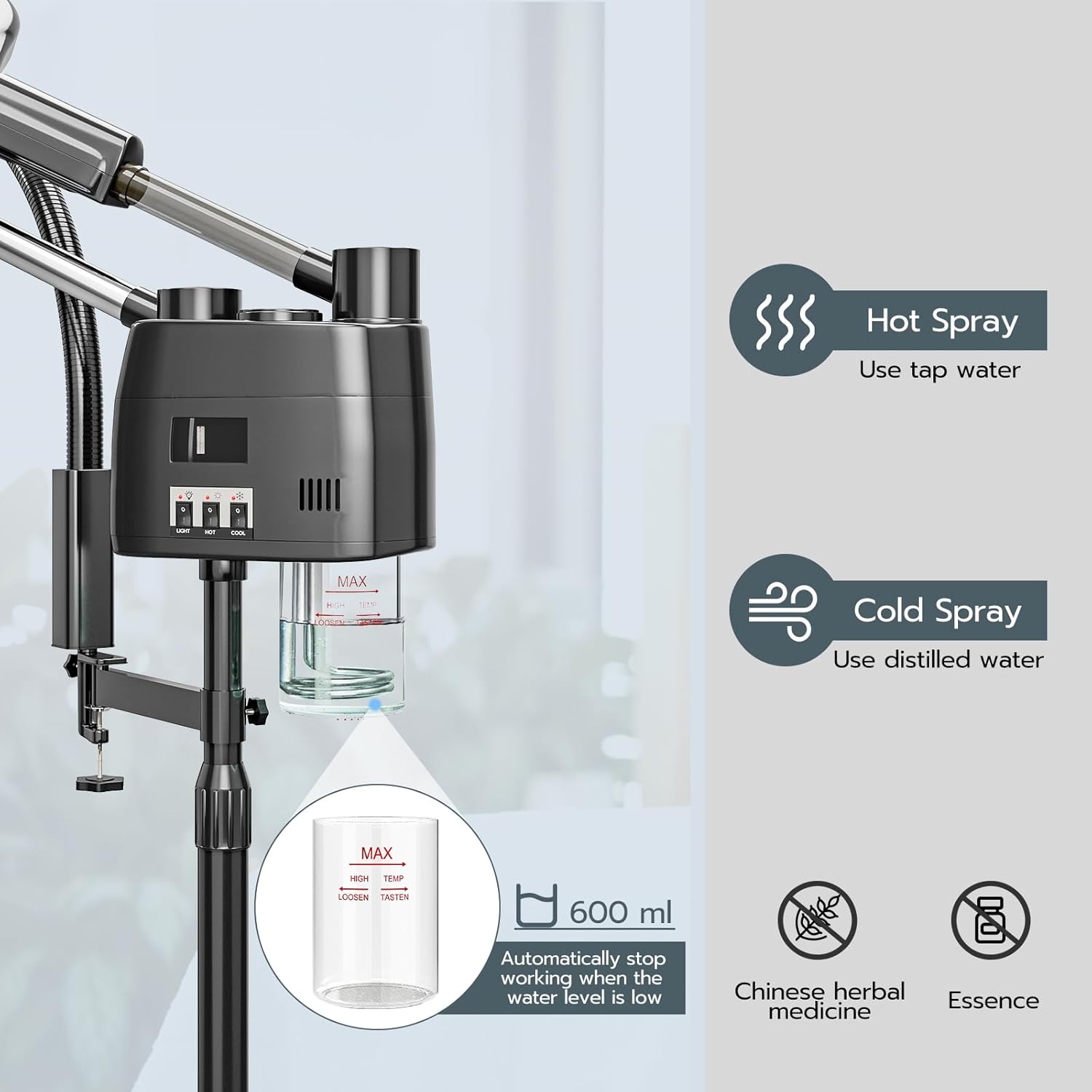 Paddie Professional 3 in 1 Facial Steamer on Wheels for Esthetician, Hot & Cold Mist, 5X LED Magnifying Lamp, Black