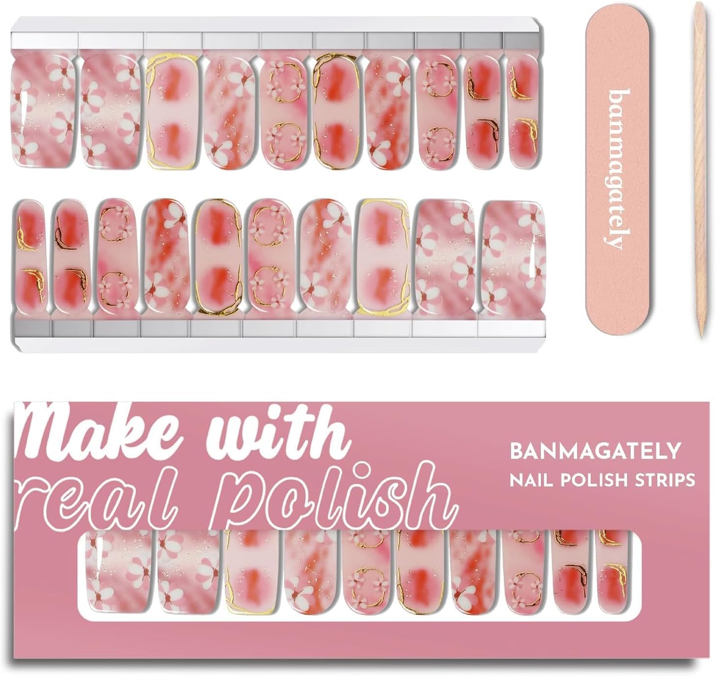 Nail Polish Strips, 20Pcs Salon Quality Gel Nail Stickers, Easy Long Lasting Wraps for Short Nails no UV Light Needed (Spring Pink Flower)