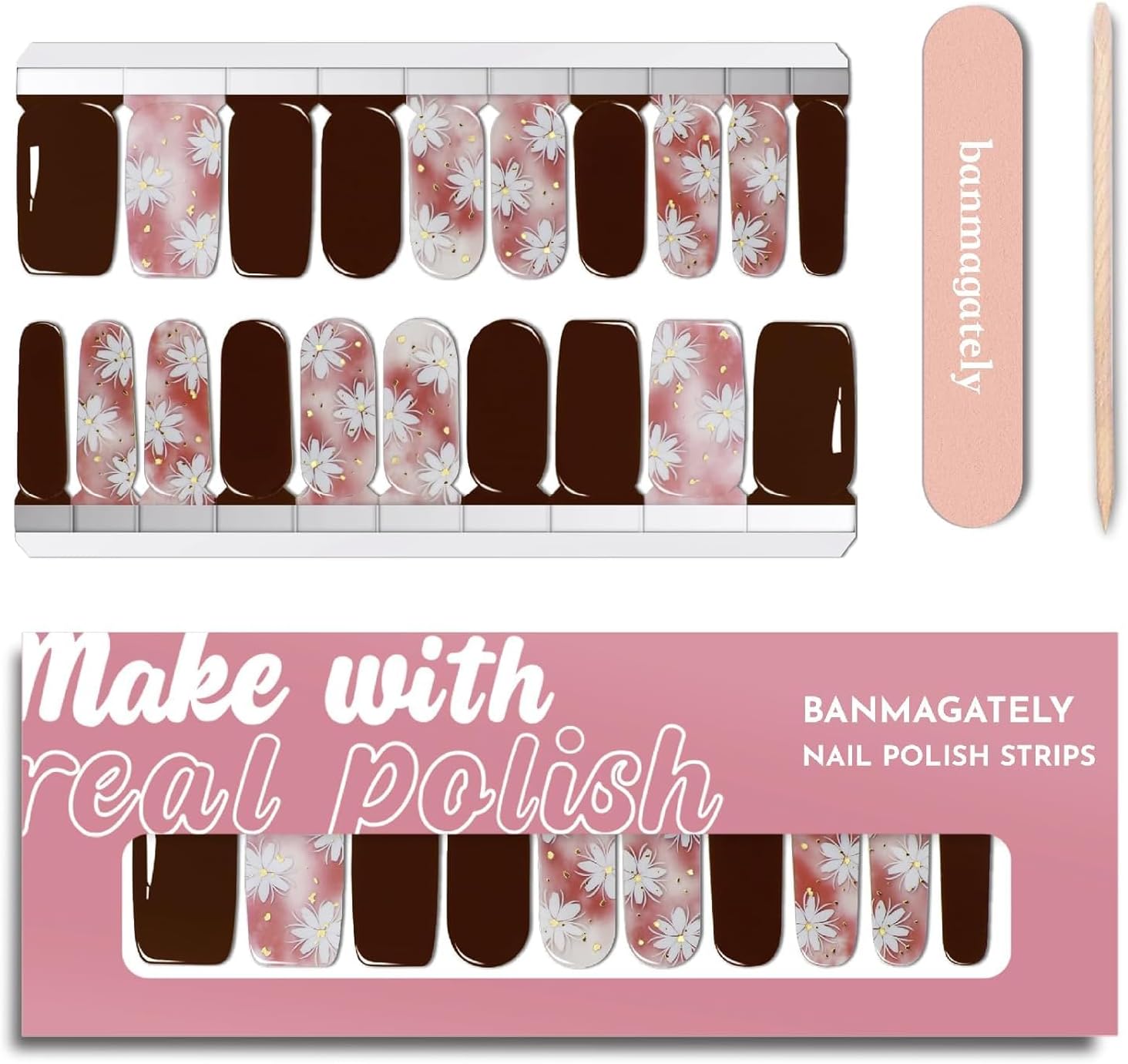 - Package Include: The whole product includes 20 pieces Water resistant Polish Nail Strips , 2 Cleaning Wipes, 1 Wood Stick, 1 Nail File, and 1 instruction manual.