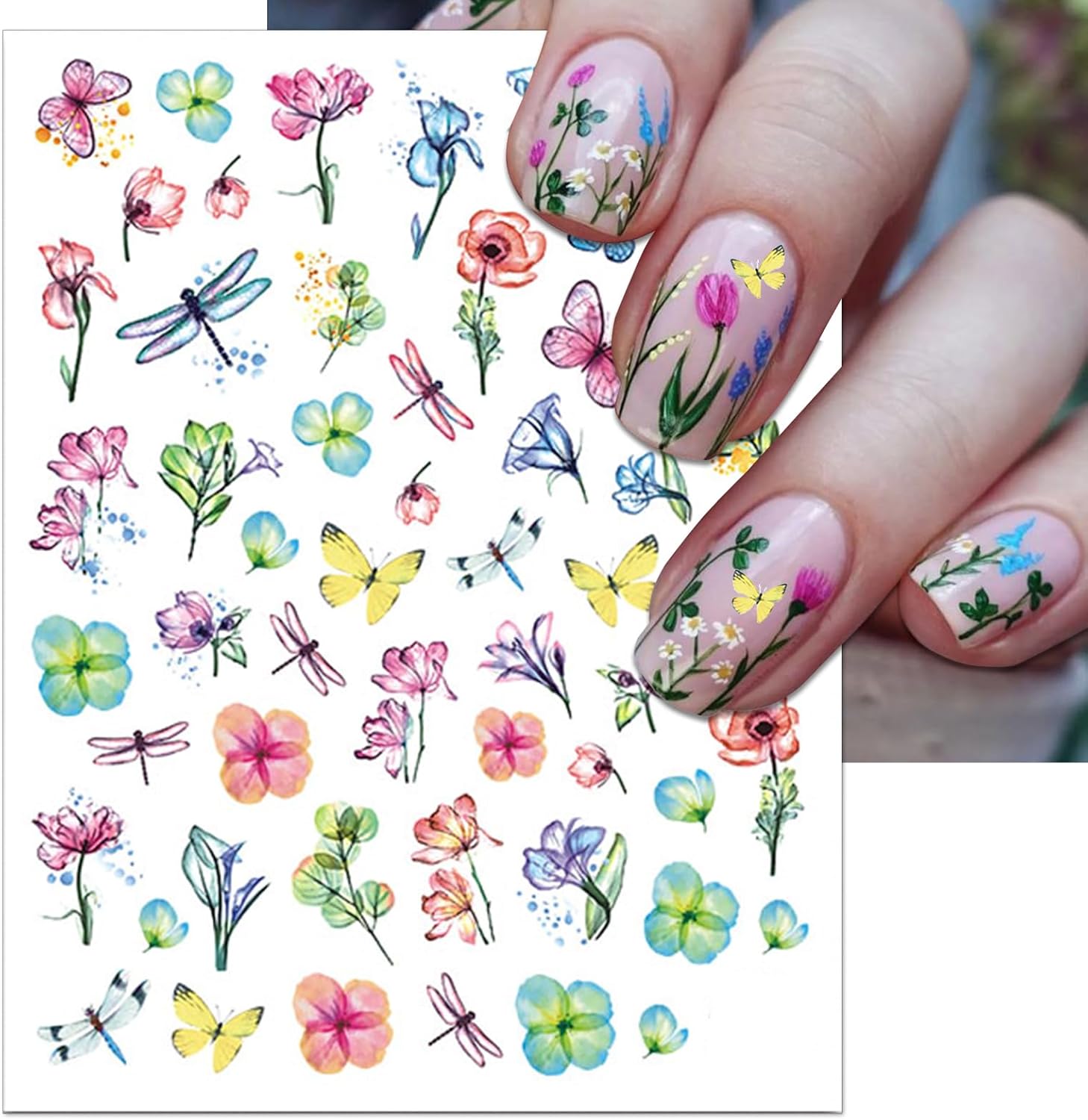 12 Sheets Flower Nail Art Stickers, Self-Adhesive Variety Colorful Floral Nail Decals, 3D Design Butterflies Dragonfly Nail Decorations for Women