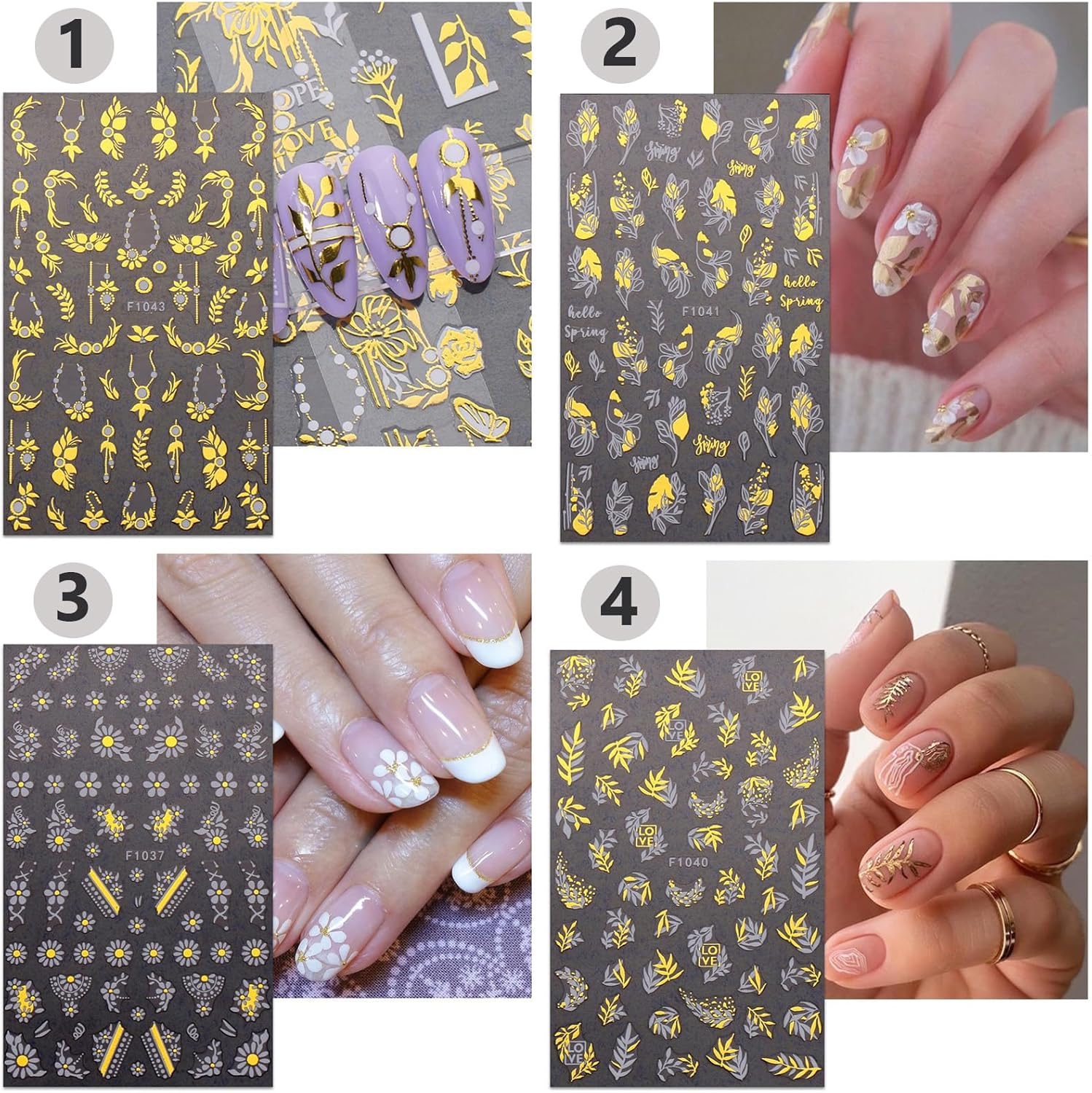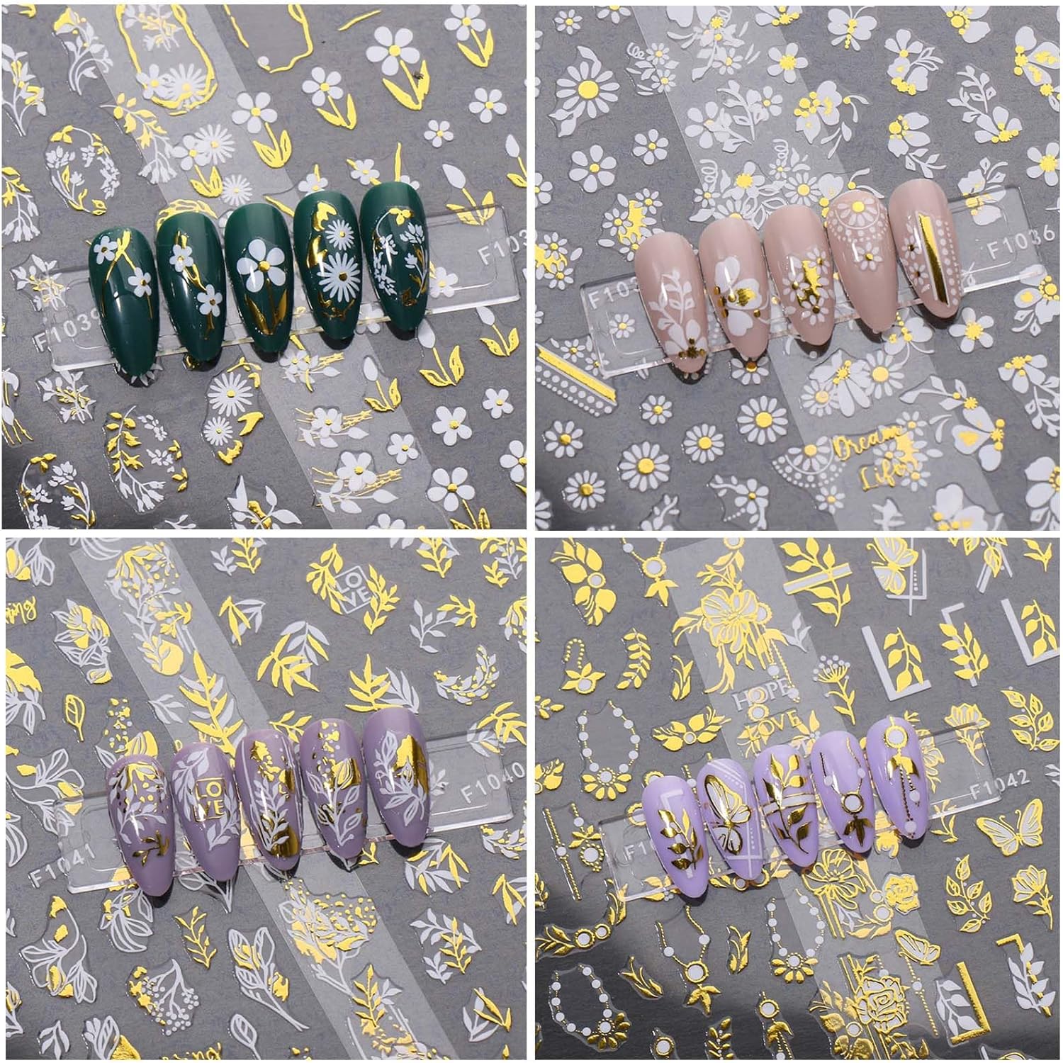 8 Sheets Gold Flower Nail Stickers - 3D Self-Adhesive Leaf Art Decals for Spring Designs - Manicure Decorations for Women, Style8