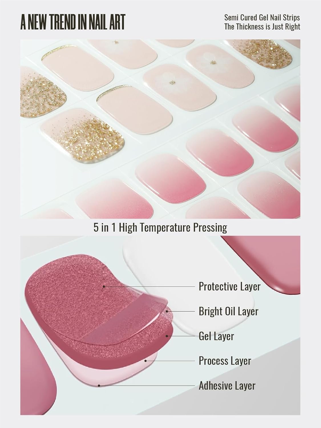 - 【REAL GEL NAIL STRIPS SET】Our nails strips are made with real gel, which means they are only 60 percent cured so they remain stretchy and flexible for application.Unlike flimsy nail stickers, these strips are supposed to feel like and last as long as a gel manicure.You don't get manicures anymore thanks to these semi cure gel nail strips that keep your nails damage-free.