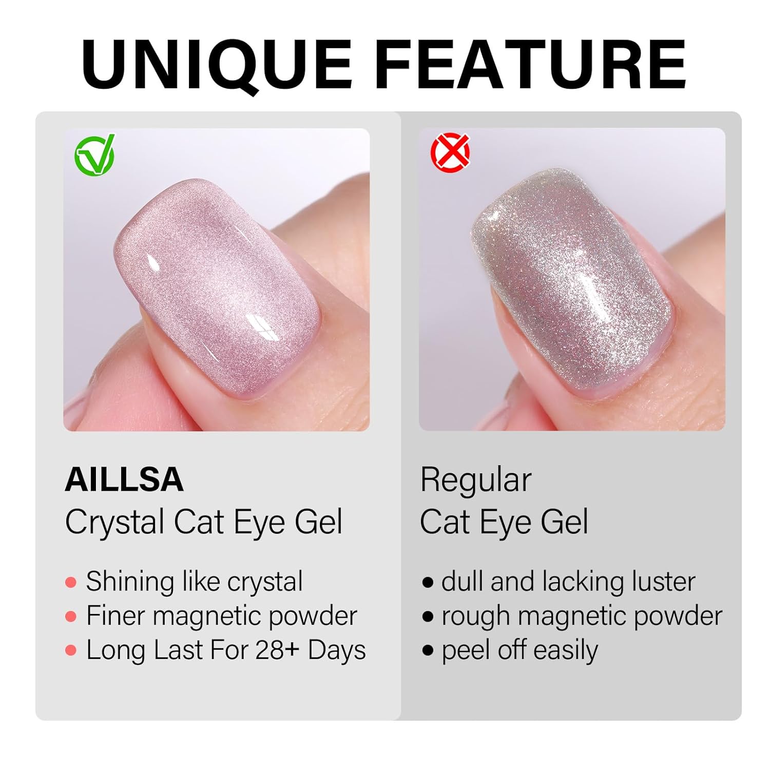 - Crystal Sparkle Effect: AILLSA cat eye gel polish creates mirror-like sparkle, crystal-clear nails, or vibrant cat-eye effects. Use it alone or pair it with any base color for stunning crystal glass nail designs featuring translucent tones and a dazzling finish.